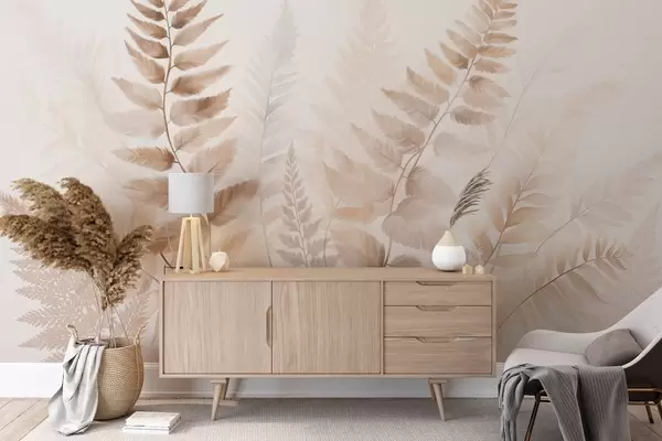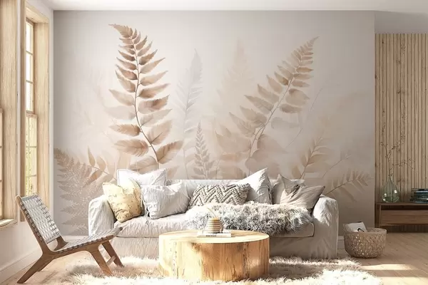 Fototapeta Teksturowane suszone liście paproci w różnych odcieniach brązu, na delikatnym, jasnym tle w stylu akwareli. Nr w09615