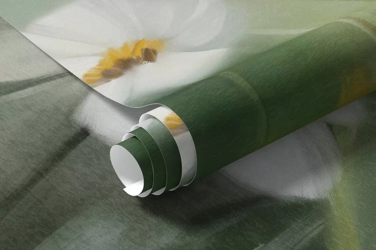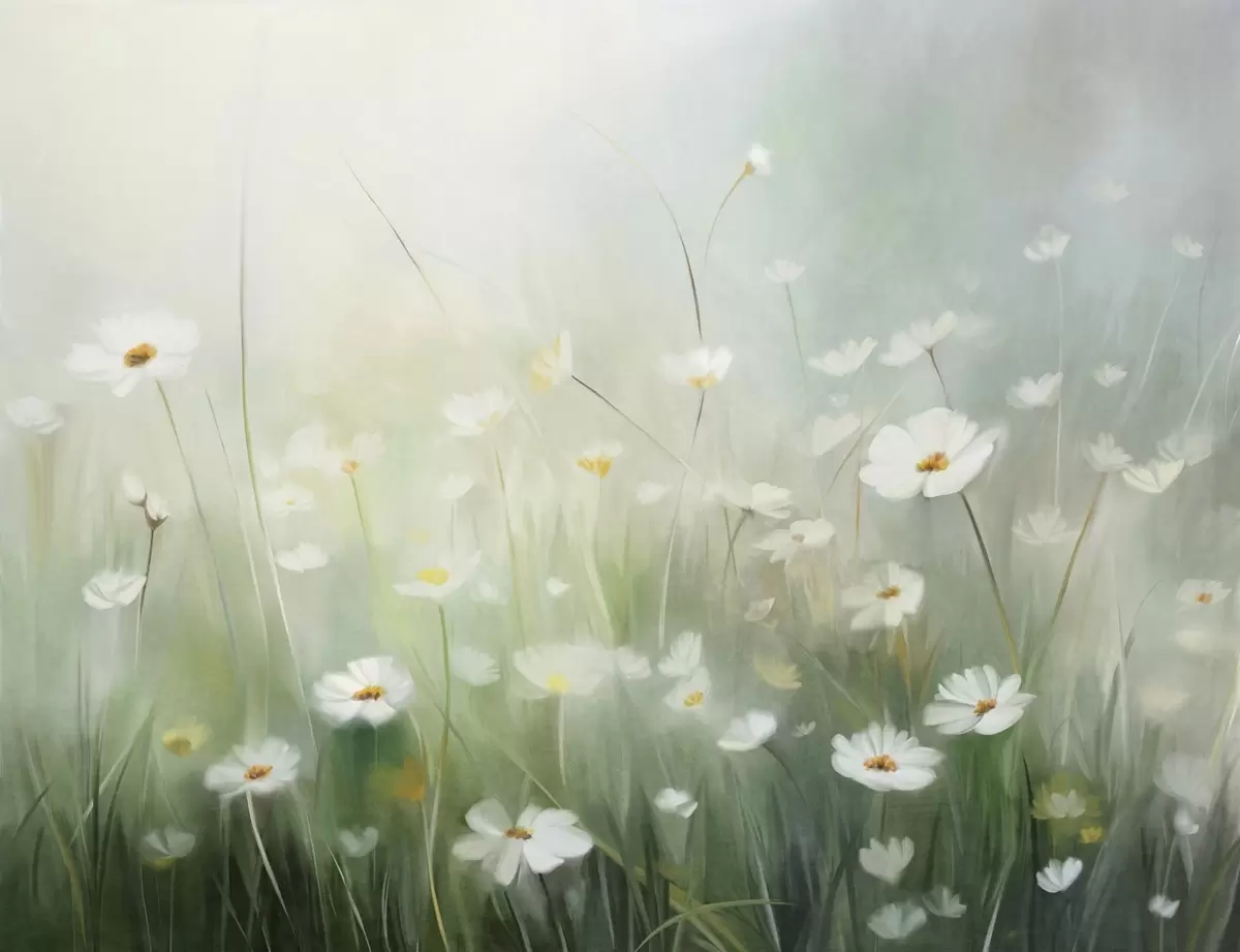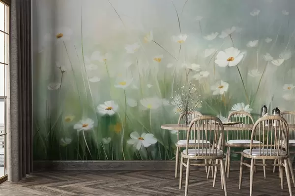 Fototapeta Abstrakcyjne pole białych stokrotek z zieloną trawą i delikatnym, zamglonym tłem w stylu malarskim. Nr w09619