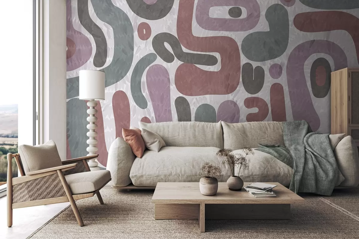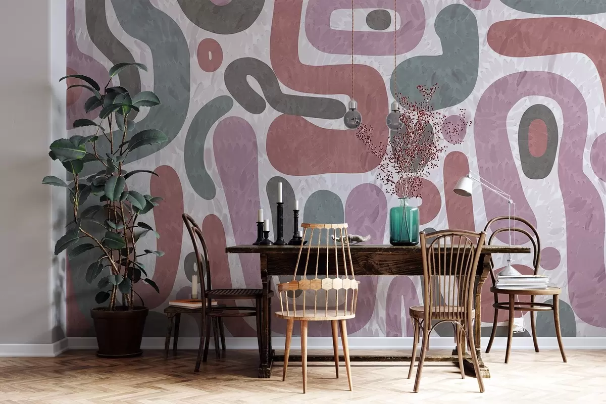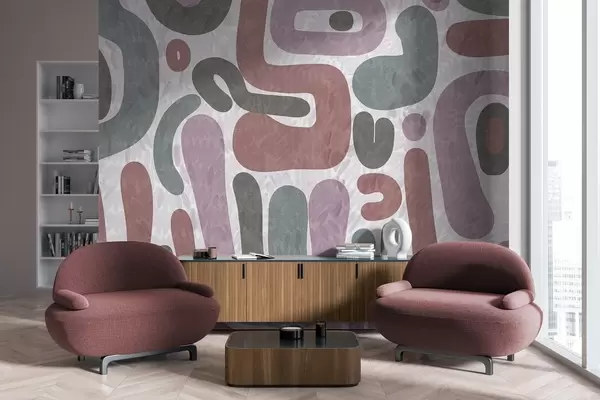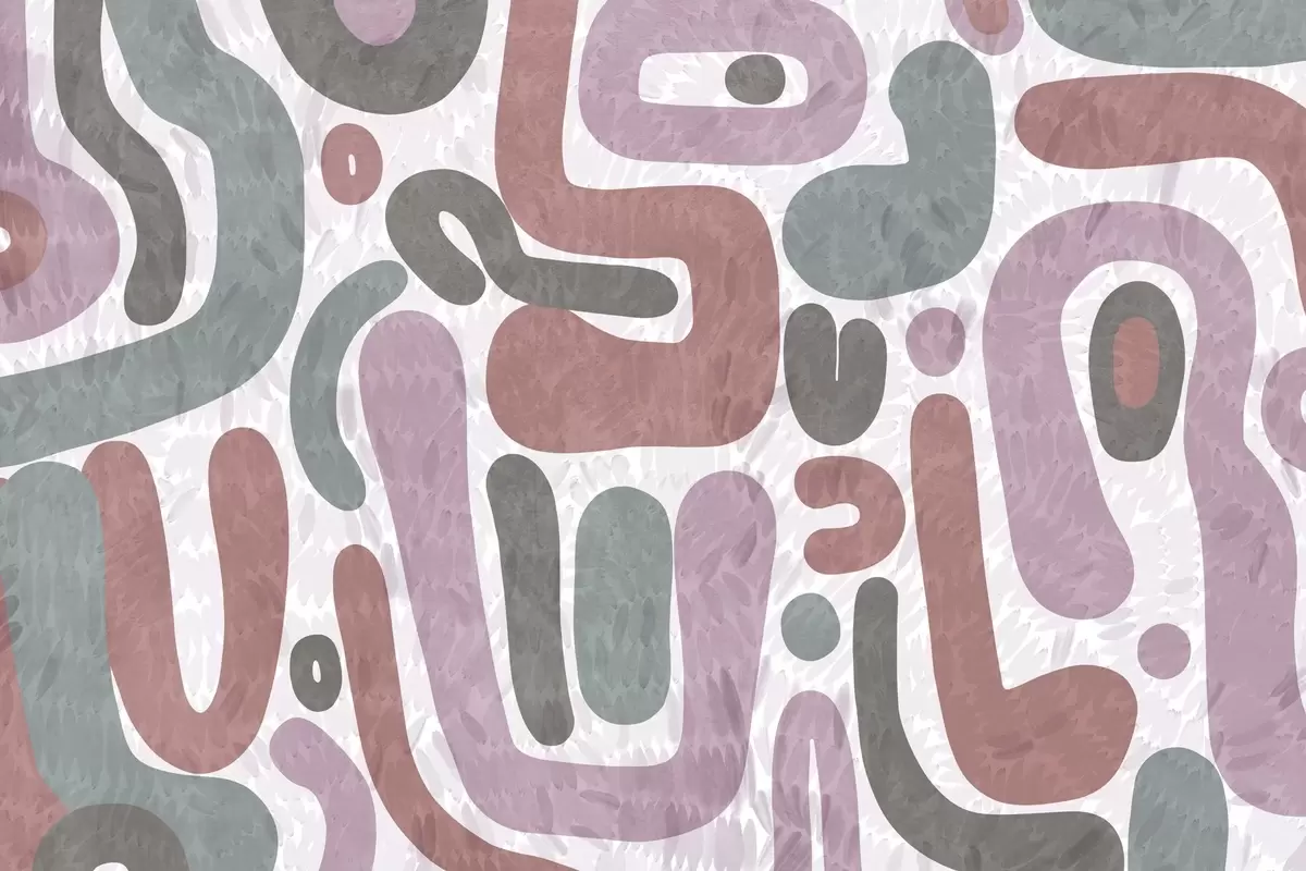 Fototapeta Abstrakcyjne, teksturowane kształty w stonowanych odcieniach różu, zieleni i szarości na teksturowanym tle – sztuka współczesna. Nr w09622