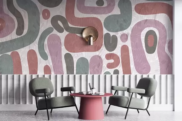 Fototapeta Abstrakcyjne, teksturowane kształty w stonowanych odcieniach różu, zieleni i szarości na teksturowanym tle – sztuka współczesna. Nr w09622