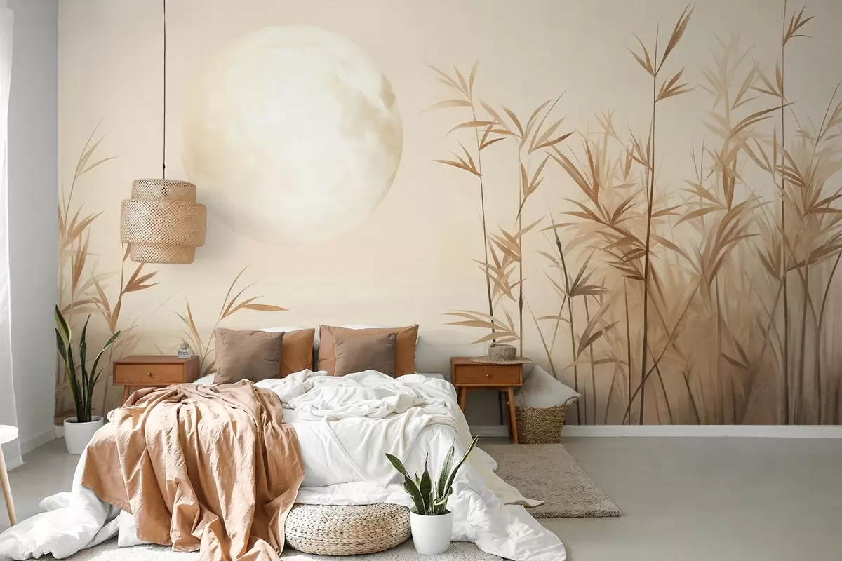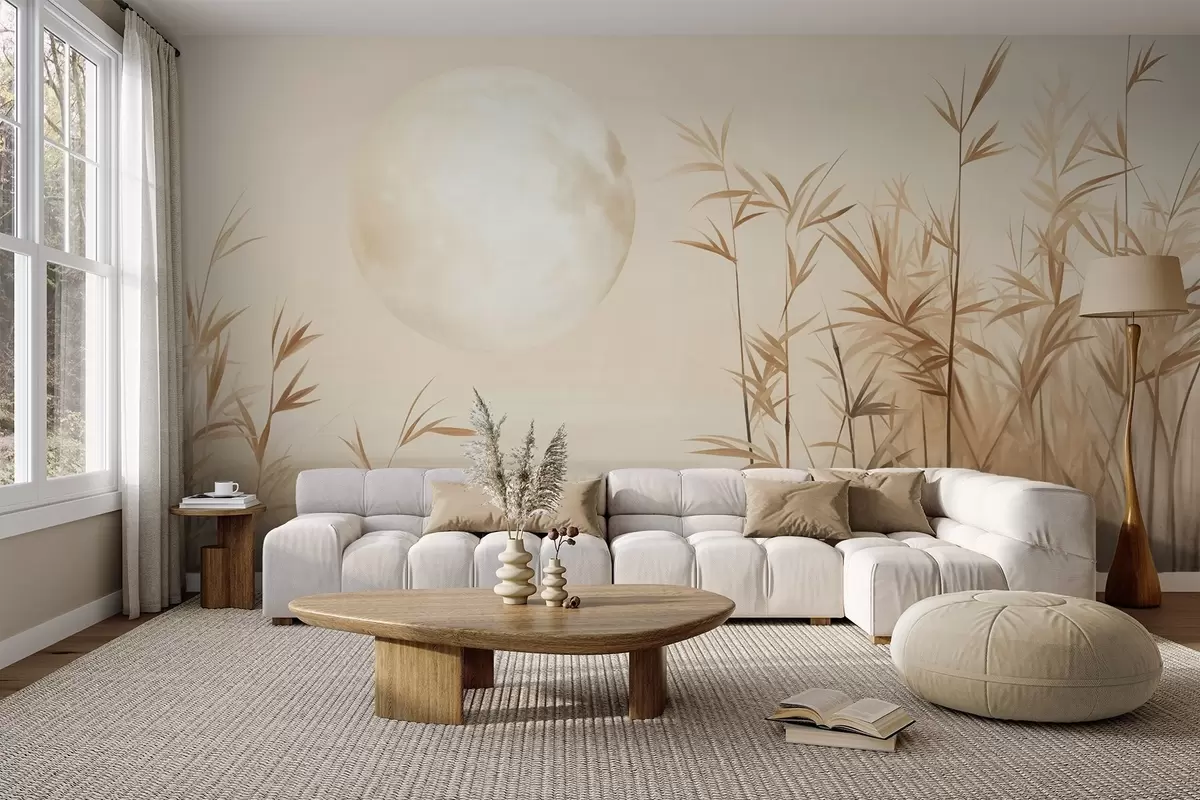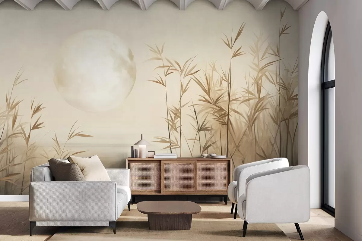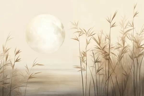 Fototapeta Teksturowany krajobraz z wysokimi trzcinami, jeziorem i bladym księżycem na zamglonym niebie Nr w09631