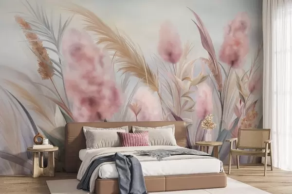 Fototapeta Różowa i beżowa trawa pampasowa oraz inne suszone kwiaty na tle delikatnego, zamglonego nieba. Nr w09635