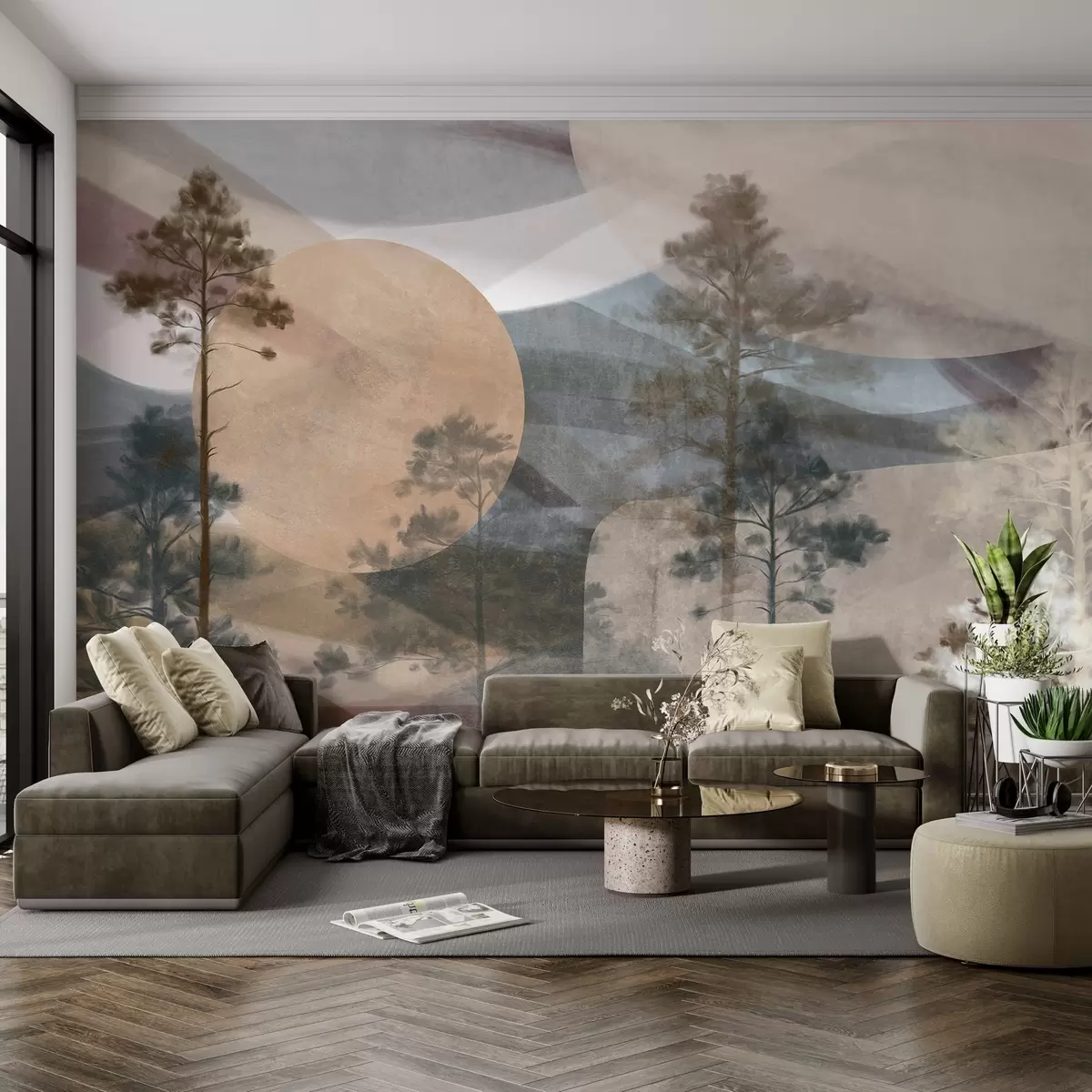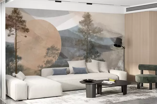 Fototapeta Wysokie sosny w stonowanym, teksturowanym krajobrazie z abstrakcyjnymi okrągłymi kształtami i warstwowymi górami w ziemistych odcieniach. Nr w09636