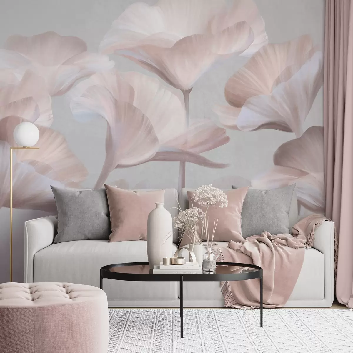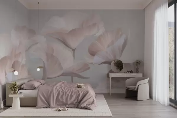 Fototapeta Jasnobrzoskwiniowe, półprzezroczyste kwiaty lotosu o delikatnych płatkach na stonowanym szarym tle. Nr w09640