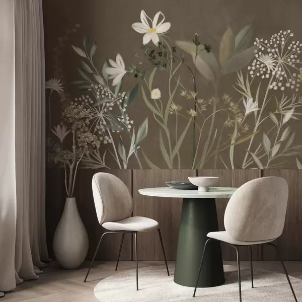 Fototapeta Delikatne, teksturowane kwiaty polne i liście w stonowanych odcieniach zieleni i kremu na brązowym tle. Nr w09641v1