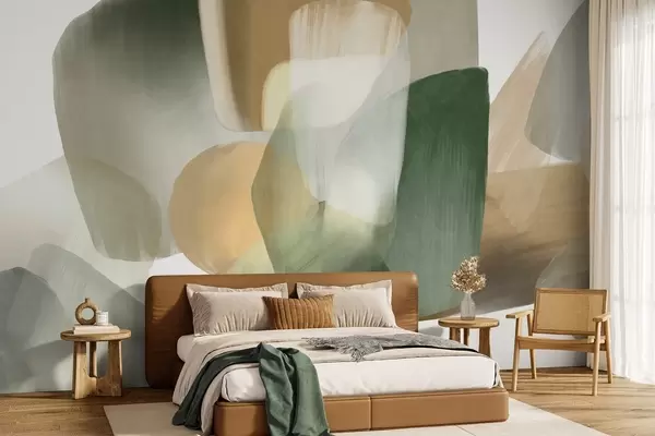 Fototapeta Abstrakcyjne, teksturowane kształty w stonowanych odcieniach zieleni i beżu, z miękkimi krawędziami i nakładającymi się warstwami. Nr w09642