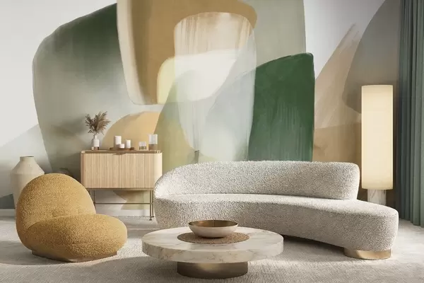 Fototapeta Abstrakcyjne, teksturowane kształty w stonowanych odcieniach zieleni i beżu, z miękkimi krawędziami i nakładającymi się warstwami. Nr w09642