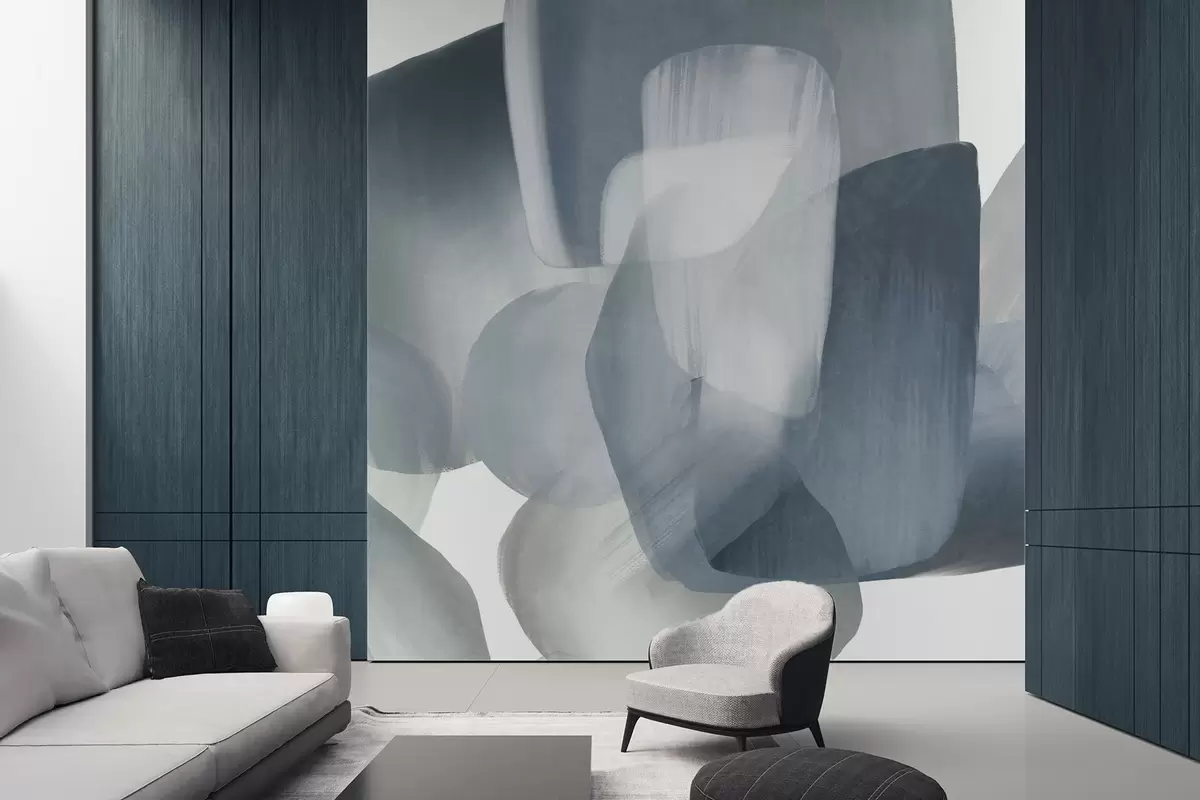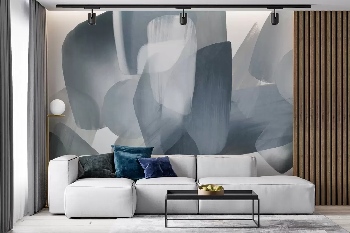 Fototapeta Abstrakcyjne, teksturowane kształty w stonowanych odcieniach niebieskiego i szarego, z miękkimi krawędziami i nakładającymi się warstwami. Nr w09642v1