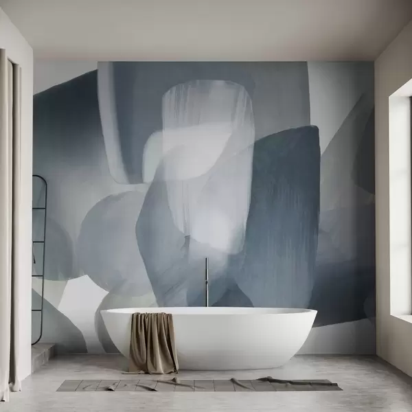 Fototapeta Abstrakcyjne, teksturowane kształty w stonowanych odcieniach niebieskiego i szarego, z miękkimi krawędziami i nakładającymi się warstwami. Nr w09642v1