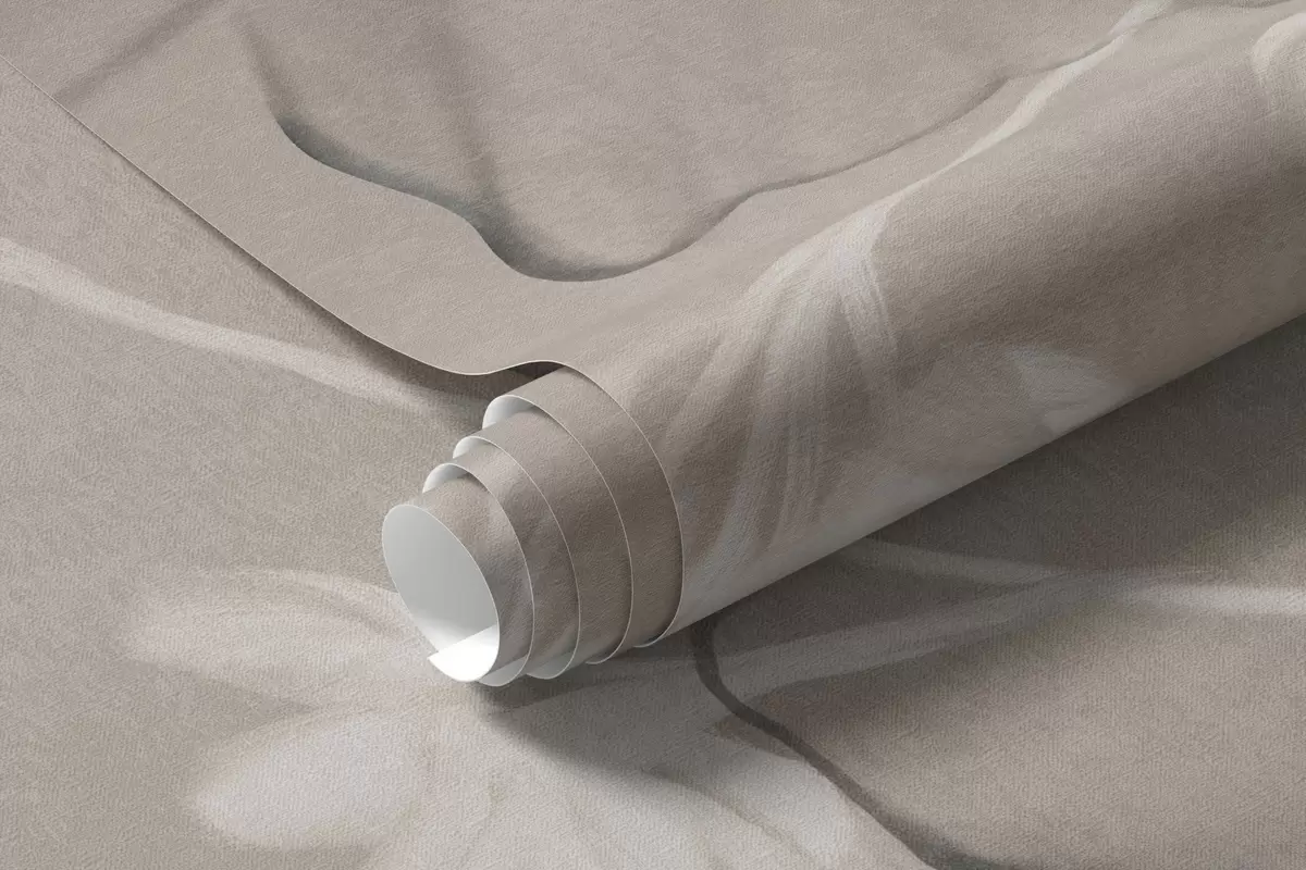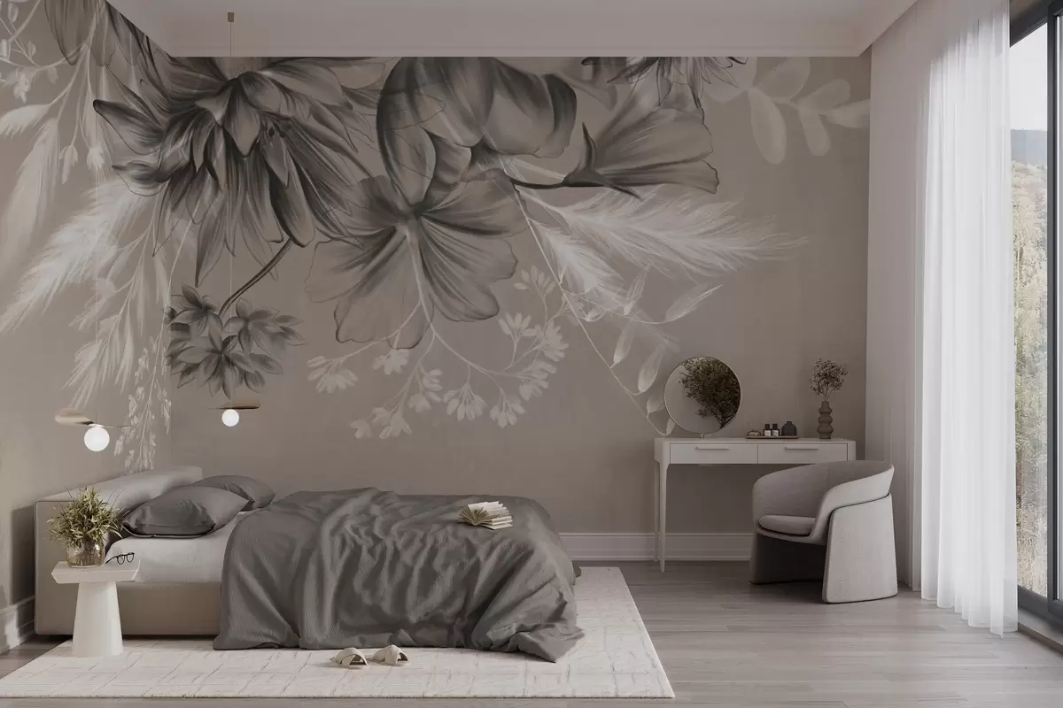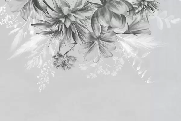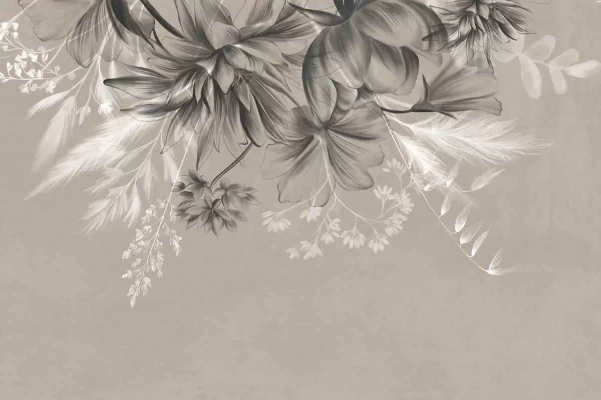 Fototapeta Teksturowane kwiaty i paprocie w odcieniach ciemnej szarości i bieli na stonowanym beżowym tle, styl rysowania Nr w09644