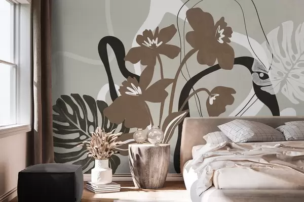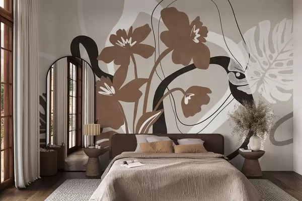 Fototapeta Abstrakcyjne, teksturowane brązowe kwiaty z białymi i czarnymi kształtami na beżowym tle, minimalistyczna sztuka Nr w09645v1