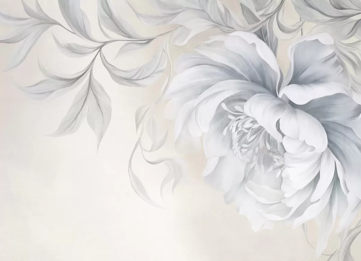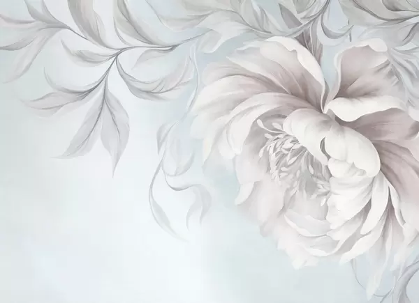 Fototapeta Duża, teksturowana piwonia o delikatnych płatkach i szarych liściach, namalowana w delikatnym stylu Nr w09647