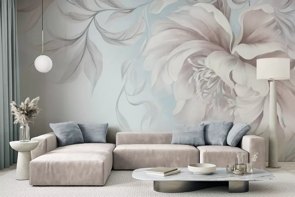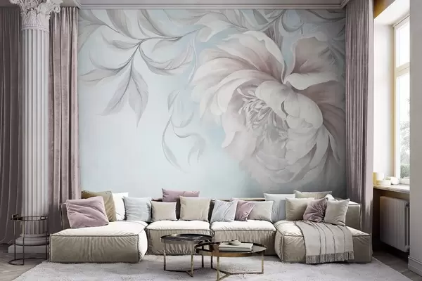 Fototapeta Duża, teksturowana piwonia o delikatnych płatkach i szarych liściach, namalowana w delikatnym stylu Nr w09647v1