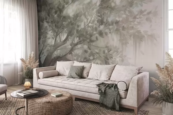Fototapeta Teksturowane drzewo z jasnozielonymi liśćmi i gałęziami, z miękkim, zamglonym tłem Nr w09650