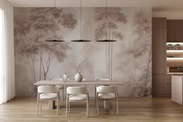 Fototapeta Abstrakcyjny pejzaż leśny w dymnych beżowych odcieniach, nadający wrażenie głębi Nr w09657