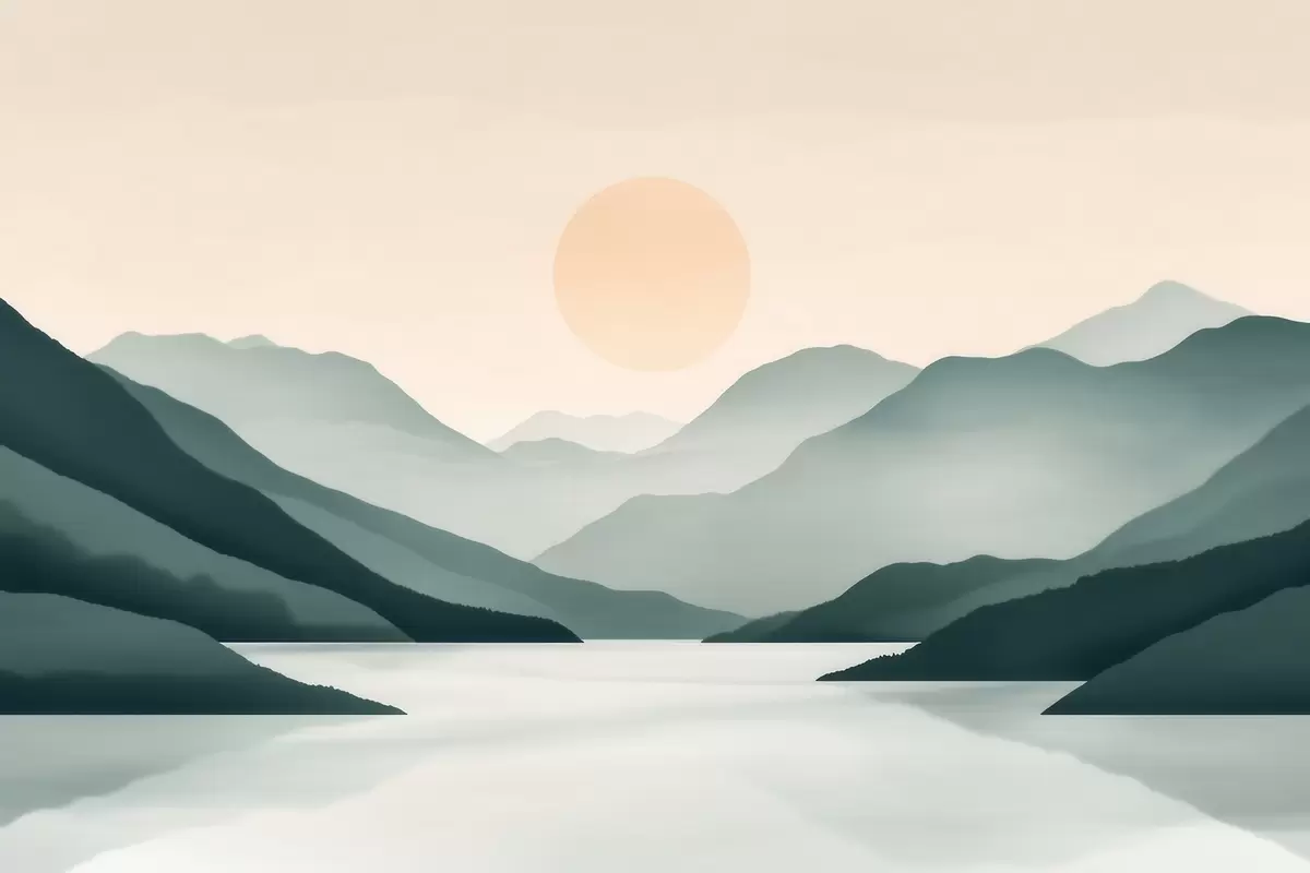 Fototapeta Spokojny górski krajobraz ze słońcem nad jeziorem Nr w09735