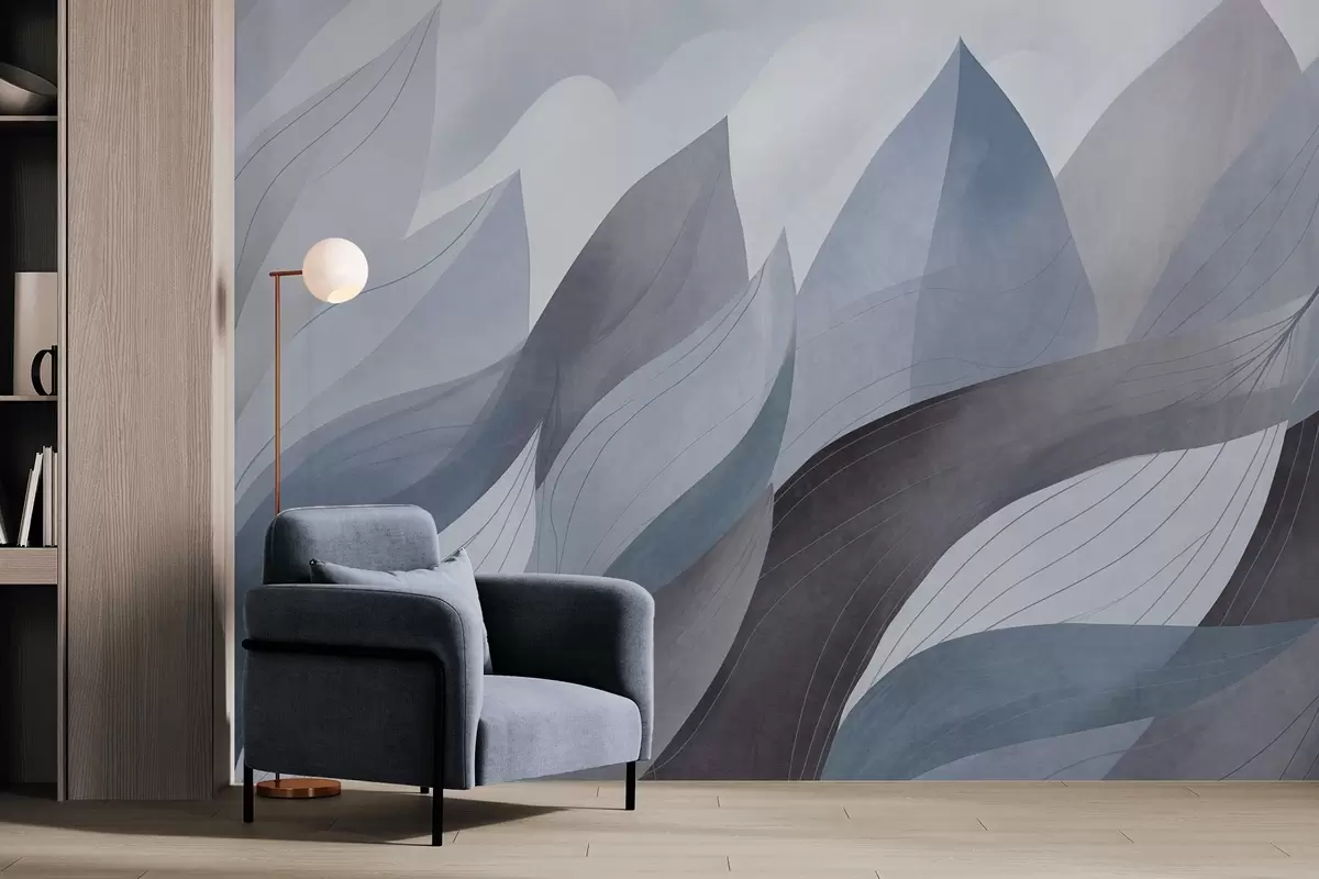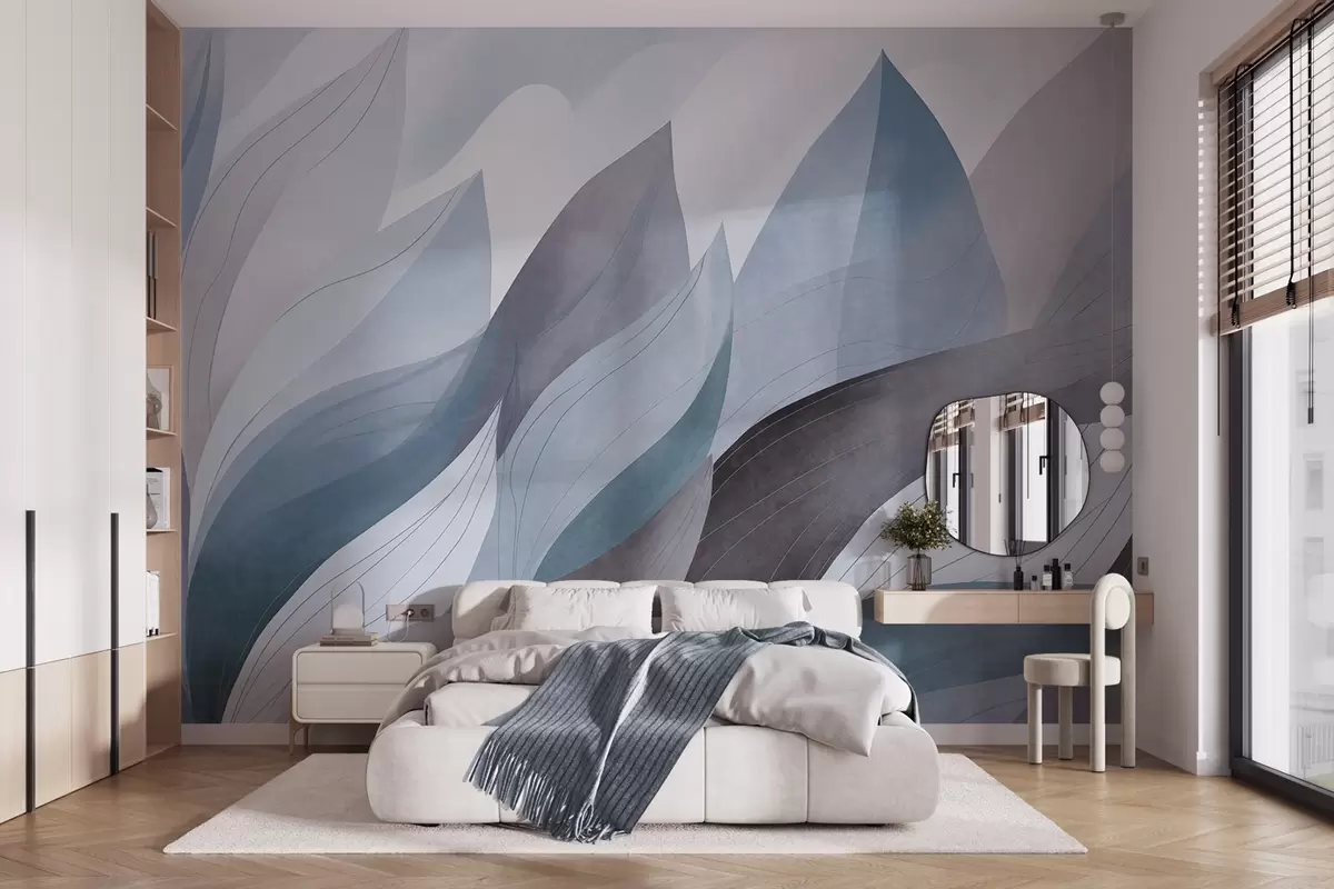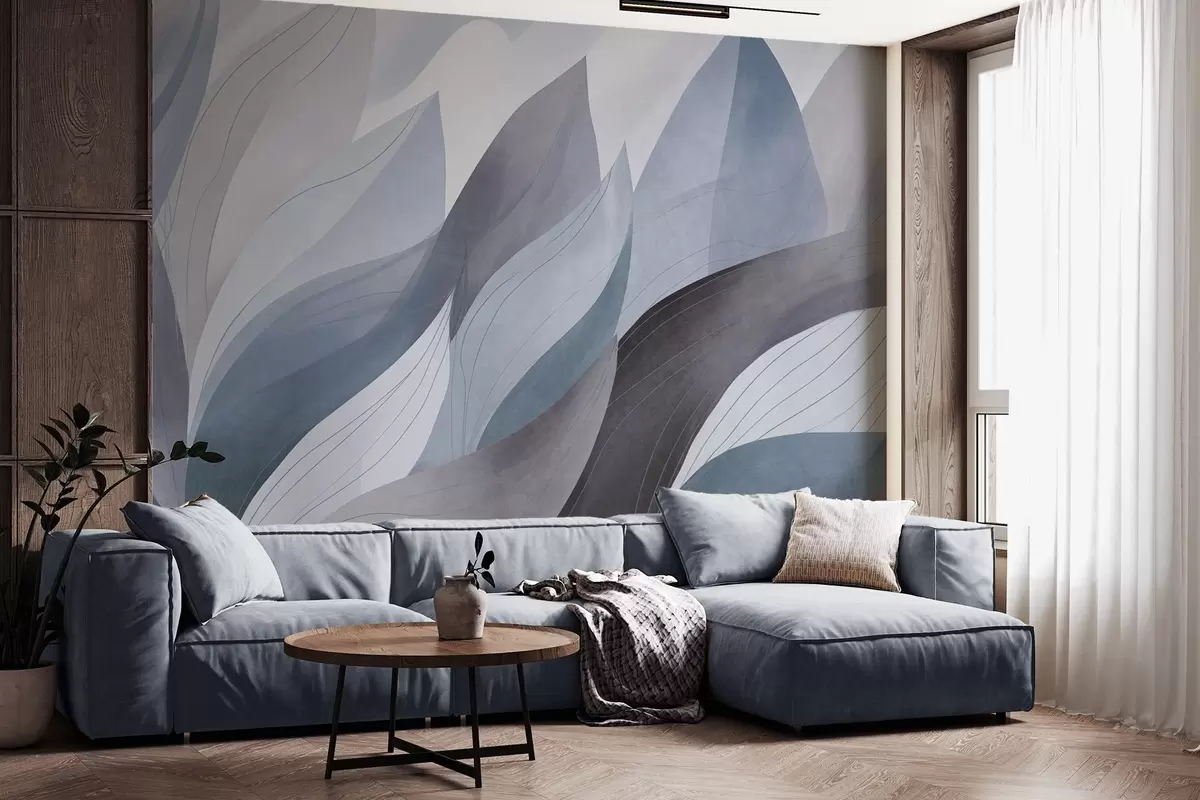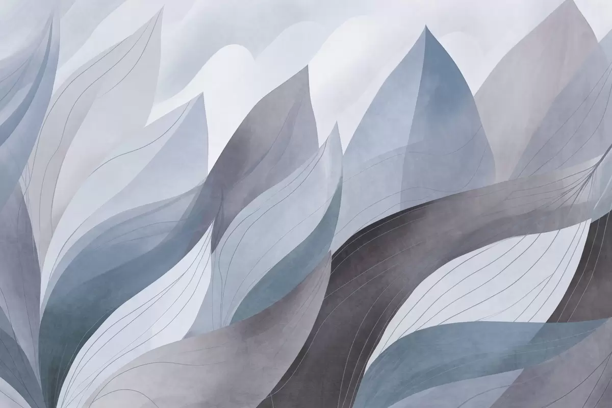 Fototapeta Abstrakcyjne liście, stonowane odcienie błękitu z delikatnymi detalami linii, miękka faktura akwareli. Nr w09736v1