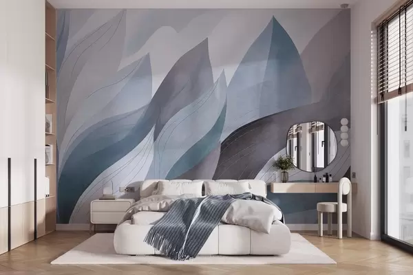 Fototapeta Abstrakcyjne liście, stonowane odcienie błękitu z delikatnymi detalami linii, miękka faktura akwareli. Nr w09736v1