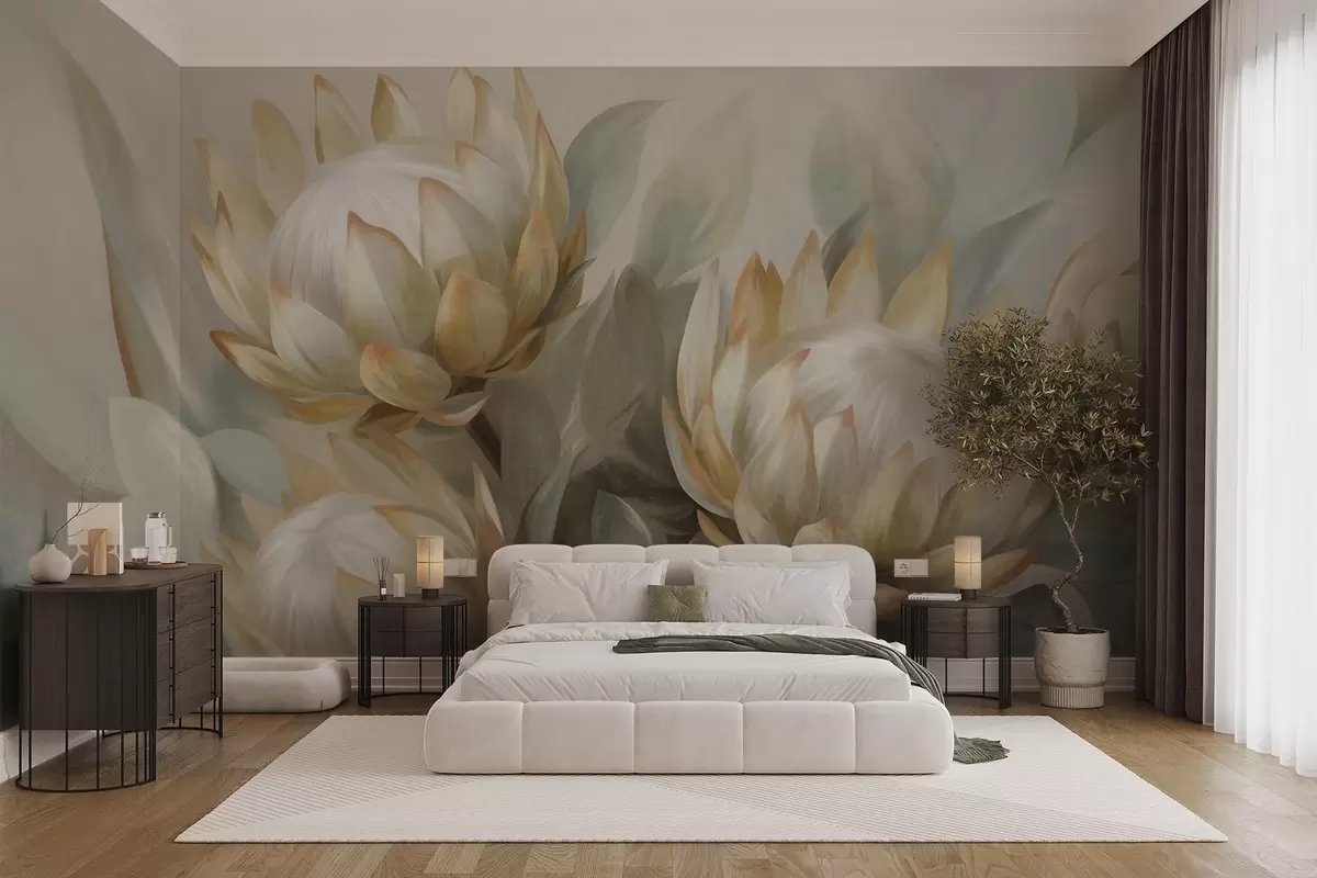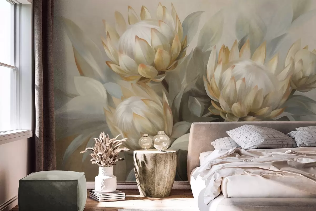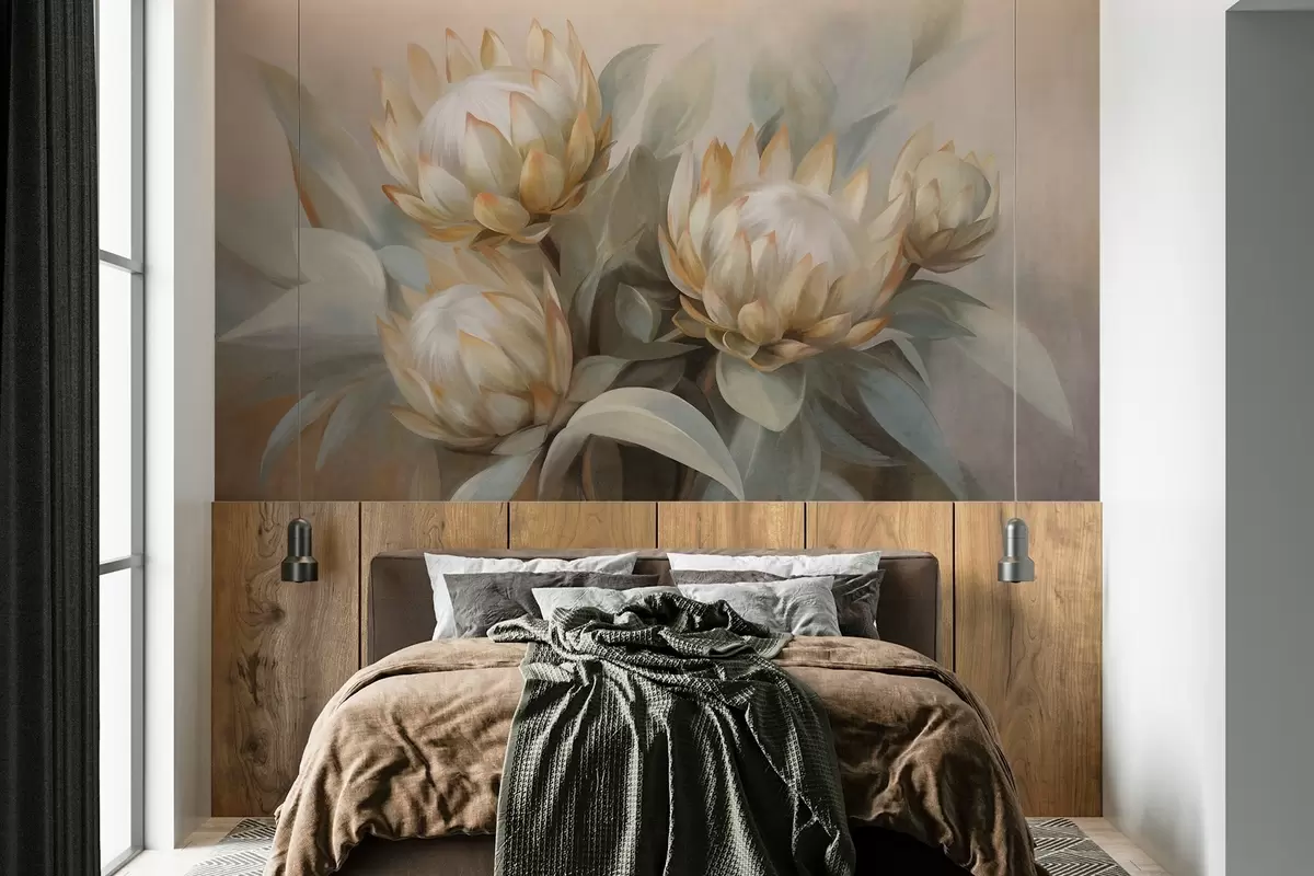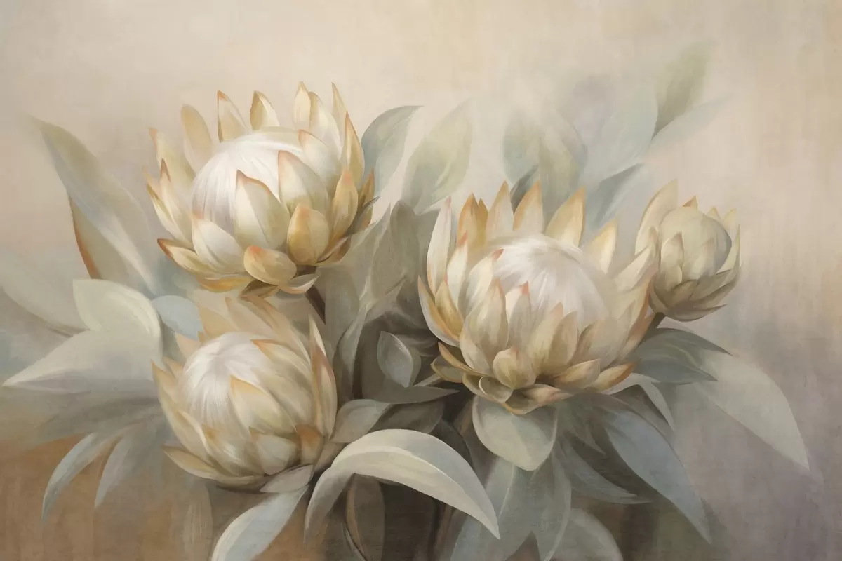 Fototapeta Teksturowane kwiaty protei z zielonymi liśćmi i miękkim, zamazanym tłem Nr w09738