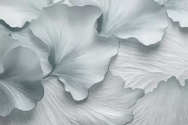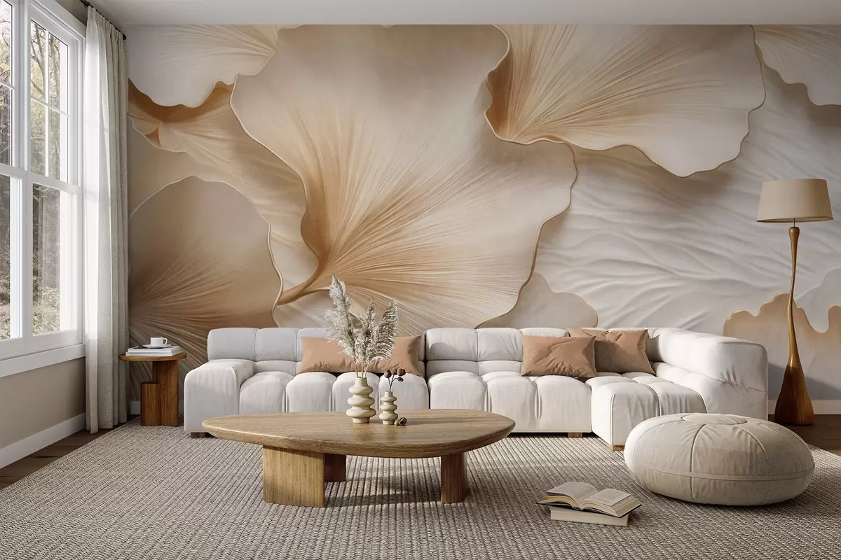 Fototapeta Teksturowane, beżowe i białe płatki liści miłorzębu japońskiego z delikatnym organicznym nadrukiem Nr w09741