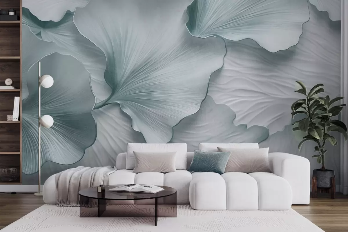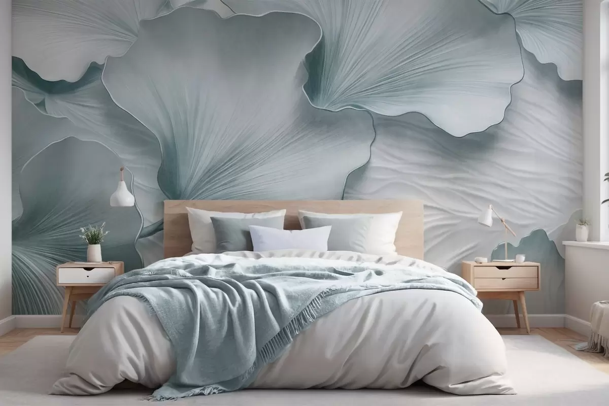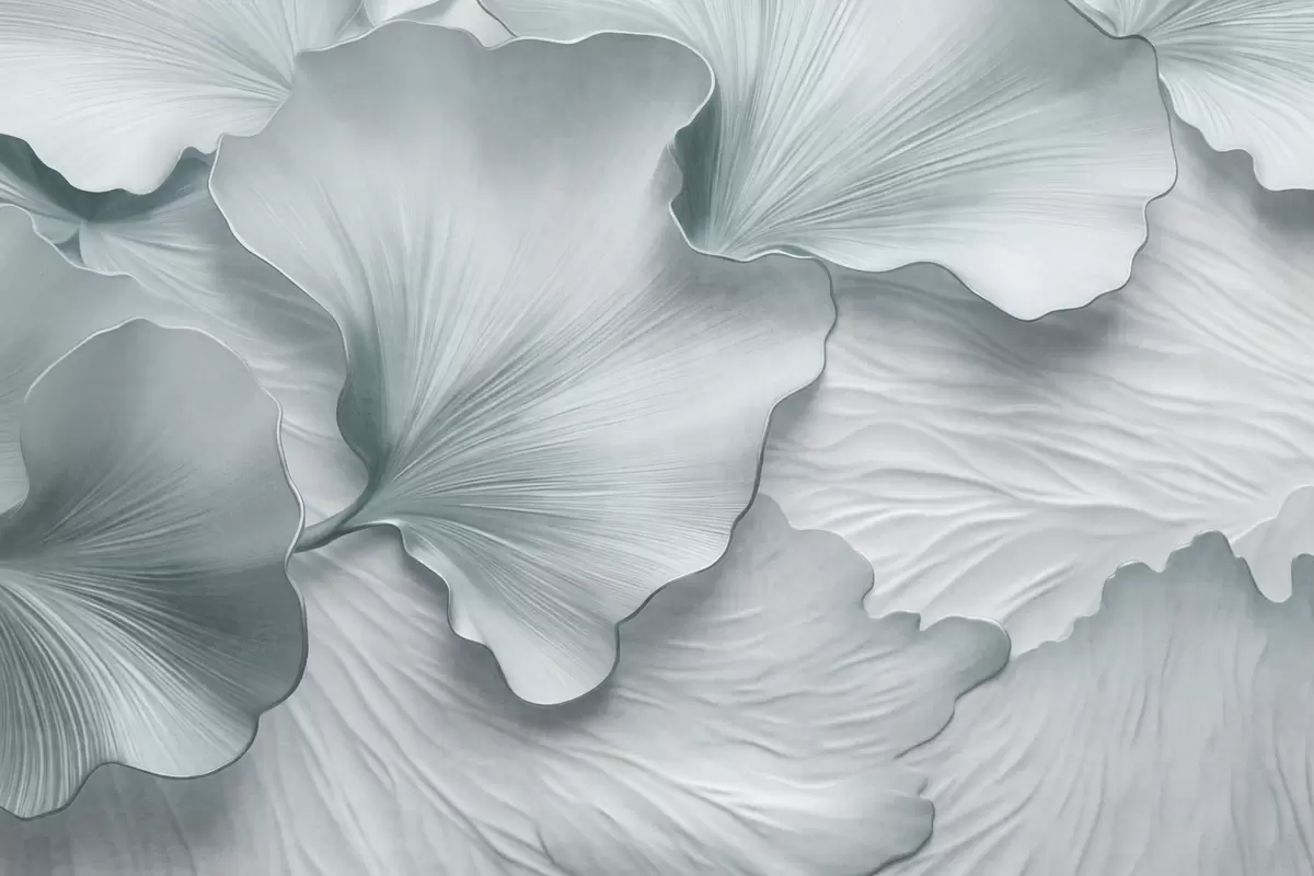 Fototapeta Teksturowane, niebiesko-białe płatki liści miłorzębu japońskiego z delikatnym organicznym nadrukiem Nr w09741v1