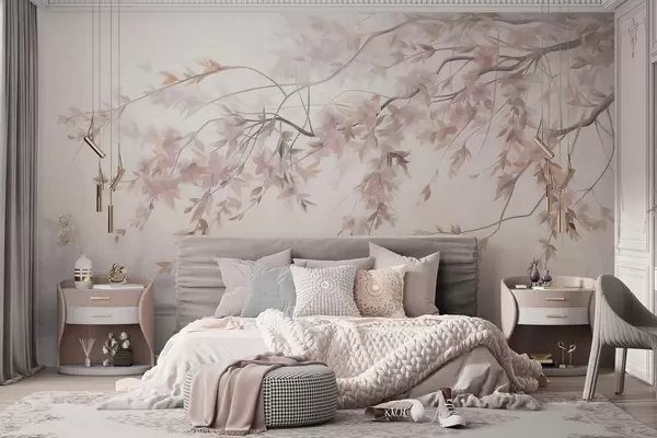 Fototapeta Teksturowany krajobraz z gałęzią kwitnącej wiśni, różowymi liśćmi i delikatnym, zamglonym tłem Nr w09743