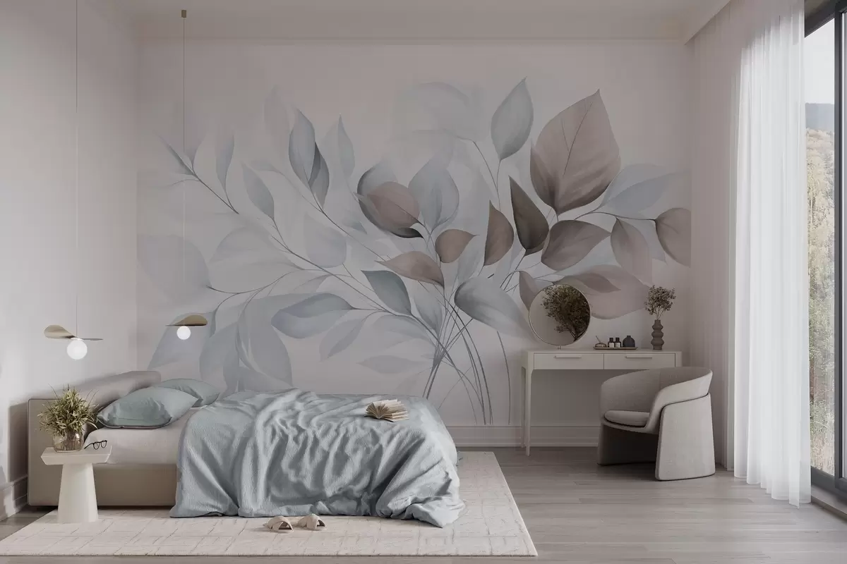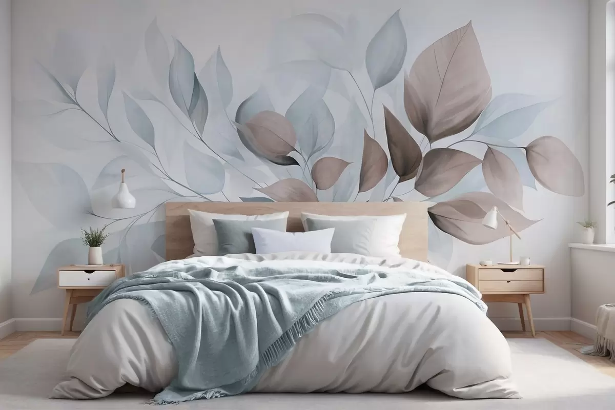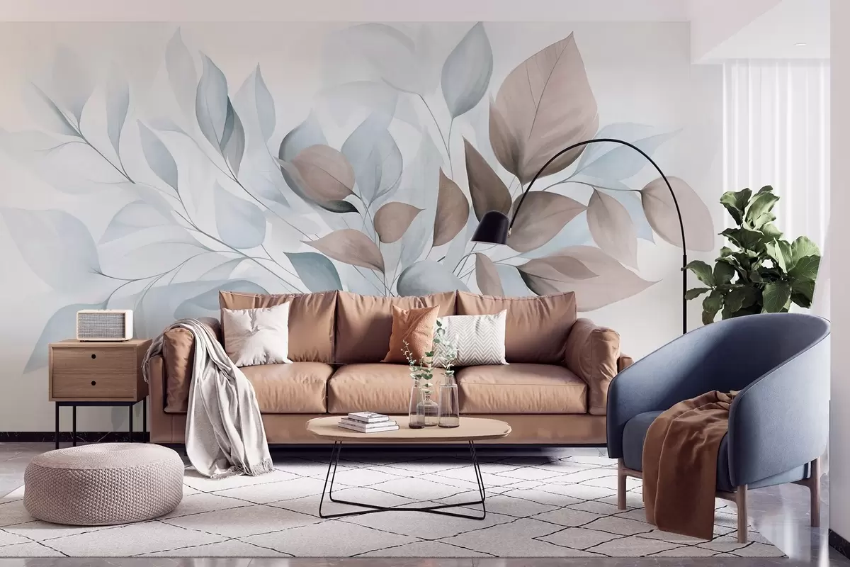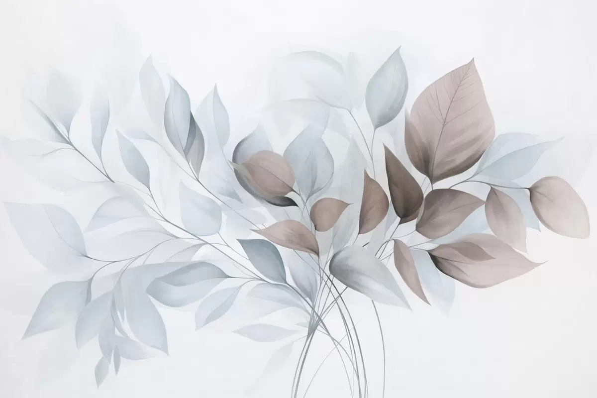 Fototapeta Abstrakcyjne, półprzezroczyste liście w odcieniach niebieskiego, beżu i brązu, teksturowana grafika Nr w09744v1