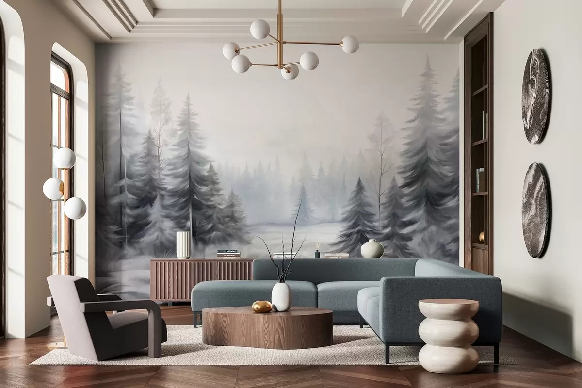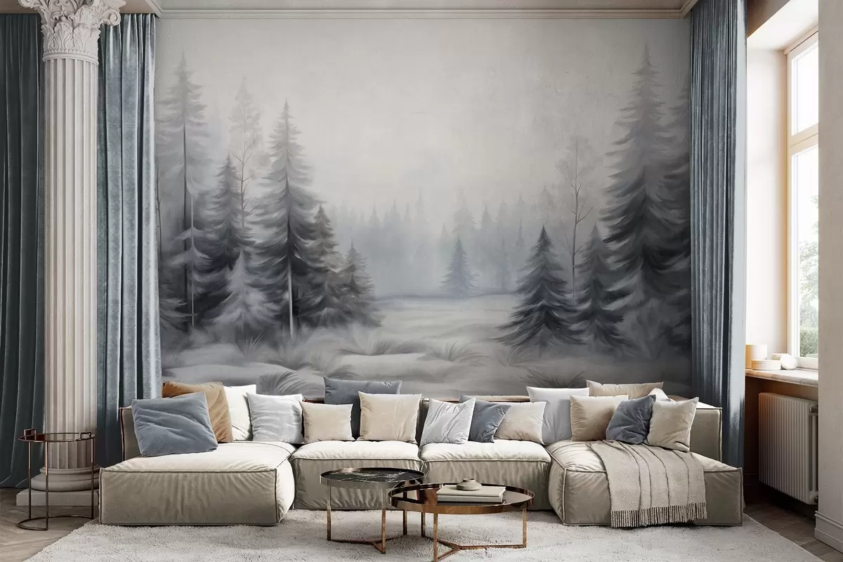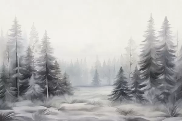 Fototapeta Teksturowane zimowe drzewa leśne we mgle, w stonowanych odcieniach szarości i bieli Nr w09745
