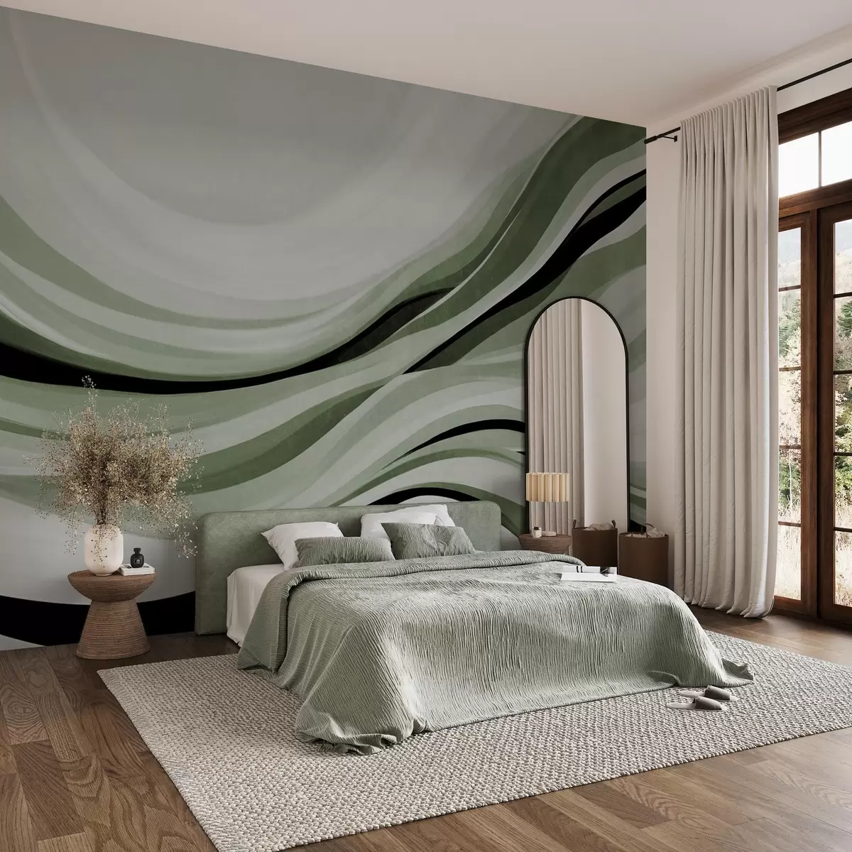 Fototapeta Abstrakcyjne faliste linie w odcieniach zieleni i czerni na jasnym tle, teksturowana grafika Nr w09748v1