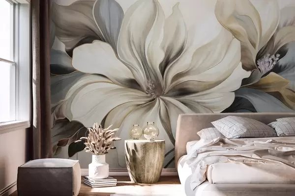 Fototapeta Duże, kremowe kwiaty magnolii z brązowymi i szarymi liśćmi, delikatne oświetlenie, abstrakcyjne tło Nr w09749