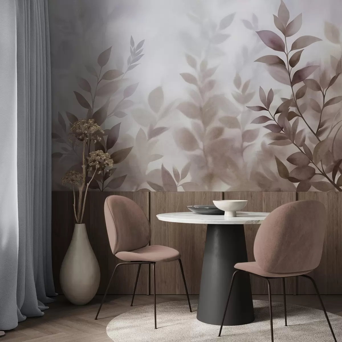 Fototapeta Delikatne gałęzie z przytłumionymi brązowymi i beżowymi liśćmi, styl akwareli, sztuka teksturowana Nr w09750