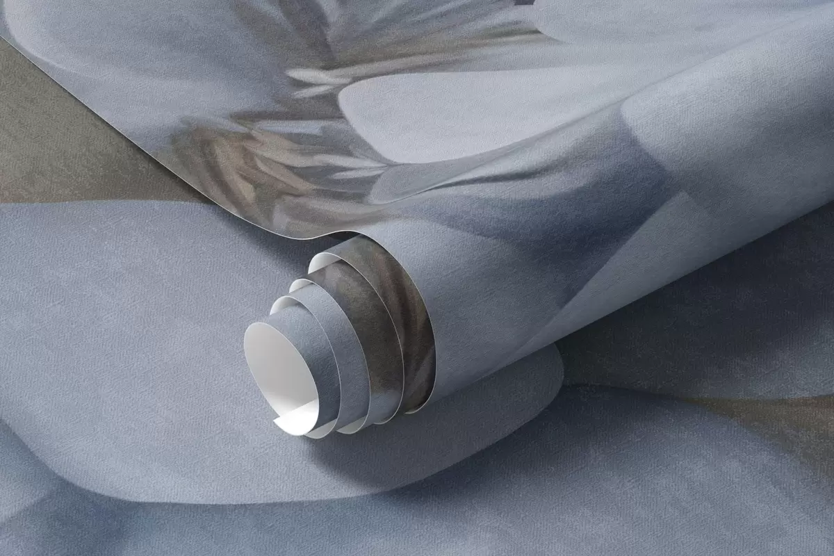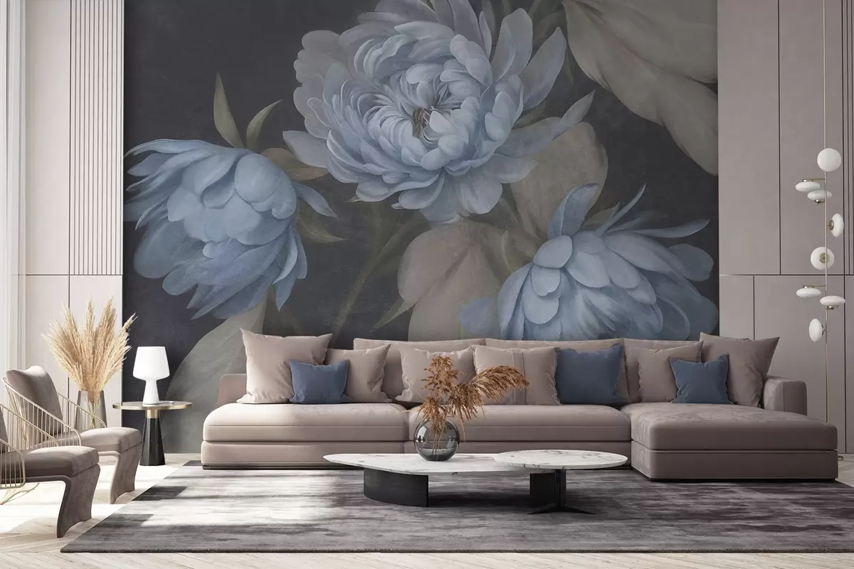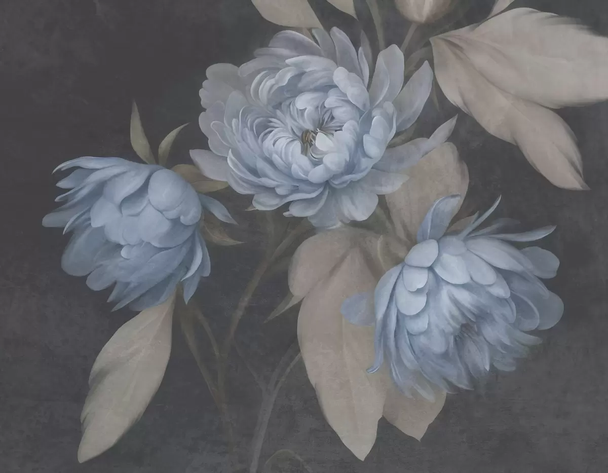 Fototapeta Teksturowane jasnoniebieskie kwiaty piwonii z beżowymi liśćmi na ciemnym tle Nr w09751