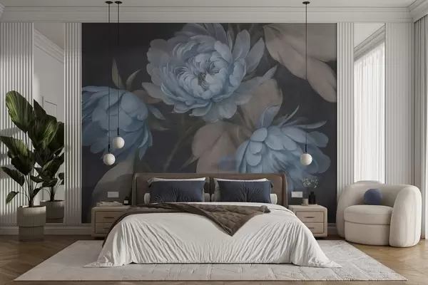 Fototapeta Teksturowane jasnoniebieskie kwiaty piwonii z beżowymi liśćmi na ciemnym tle Nr w09751