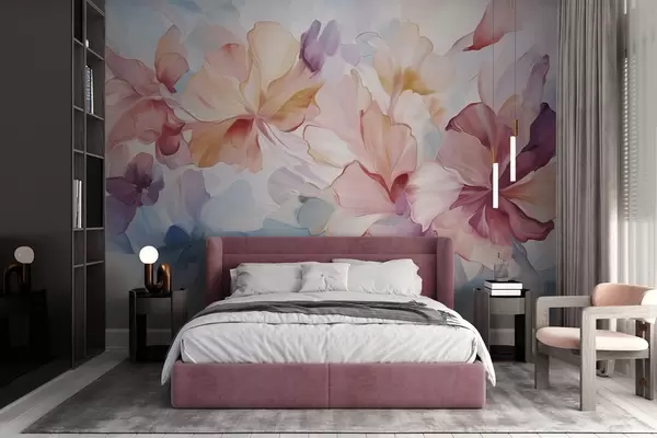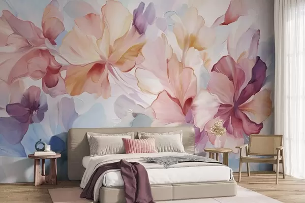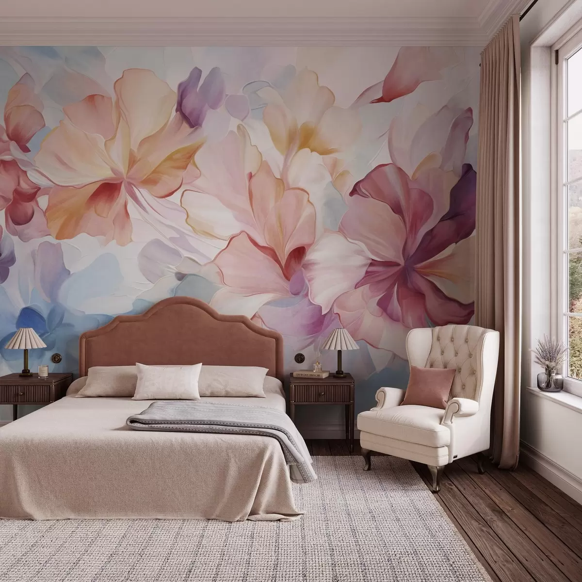 Fototapeta Abstrakcyjne, fantazyjne kwiaty w odcieniach różu, brzoskwini i lawendy, utrzymane w stylu malarskim, z wyrazistą fakturą Nr w09767