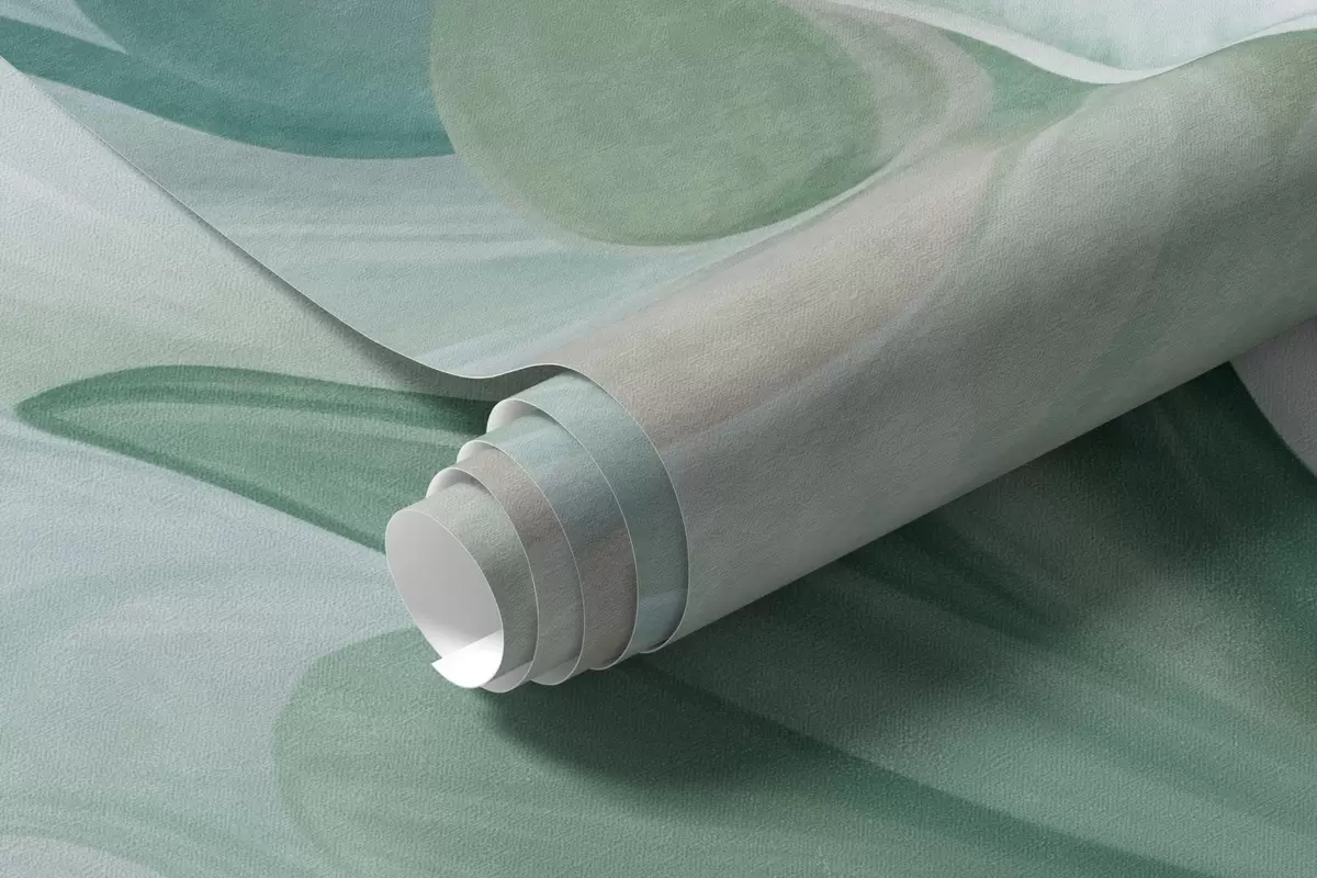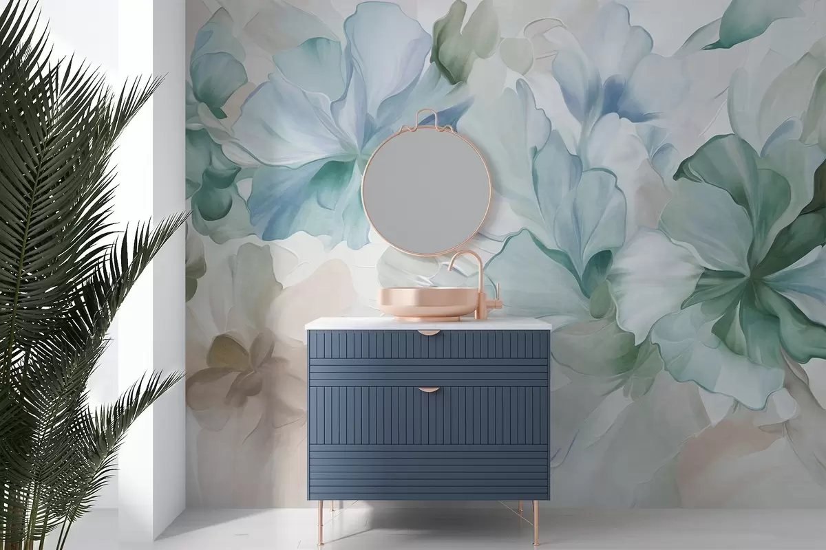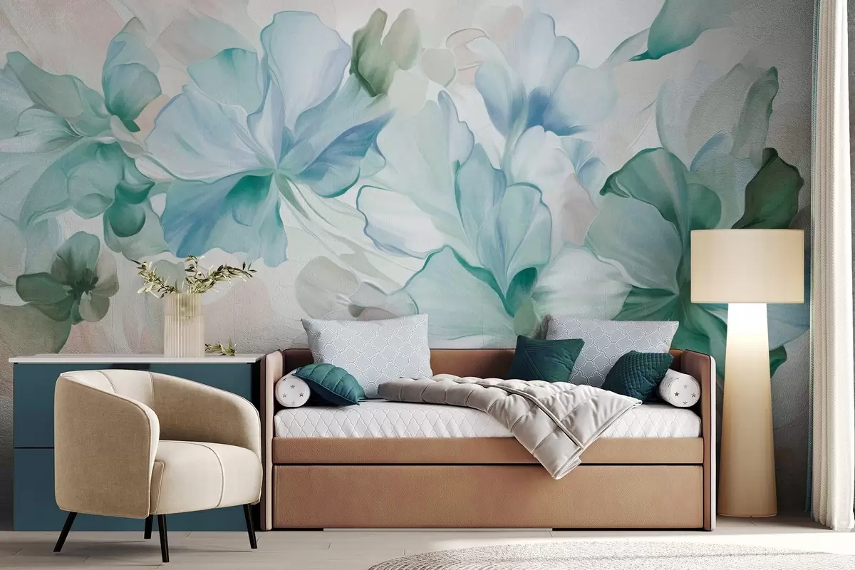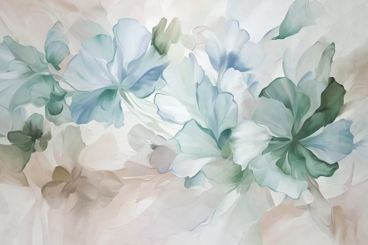 Fototapeta Abstrakcyjne, fantazyjne kwiaty w odcieniach zieleni, błękitu i beżu, utrzymane w stylu malarskim, grafika z fakturą Nr w09767v1
