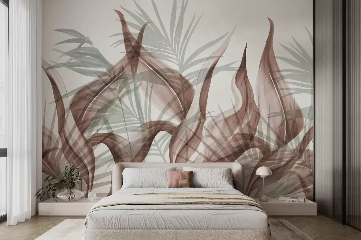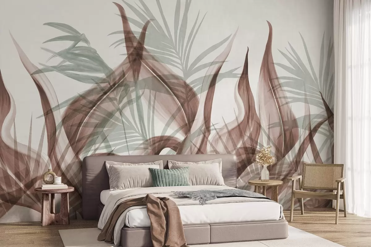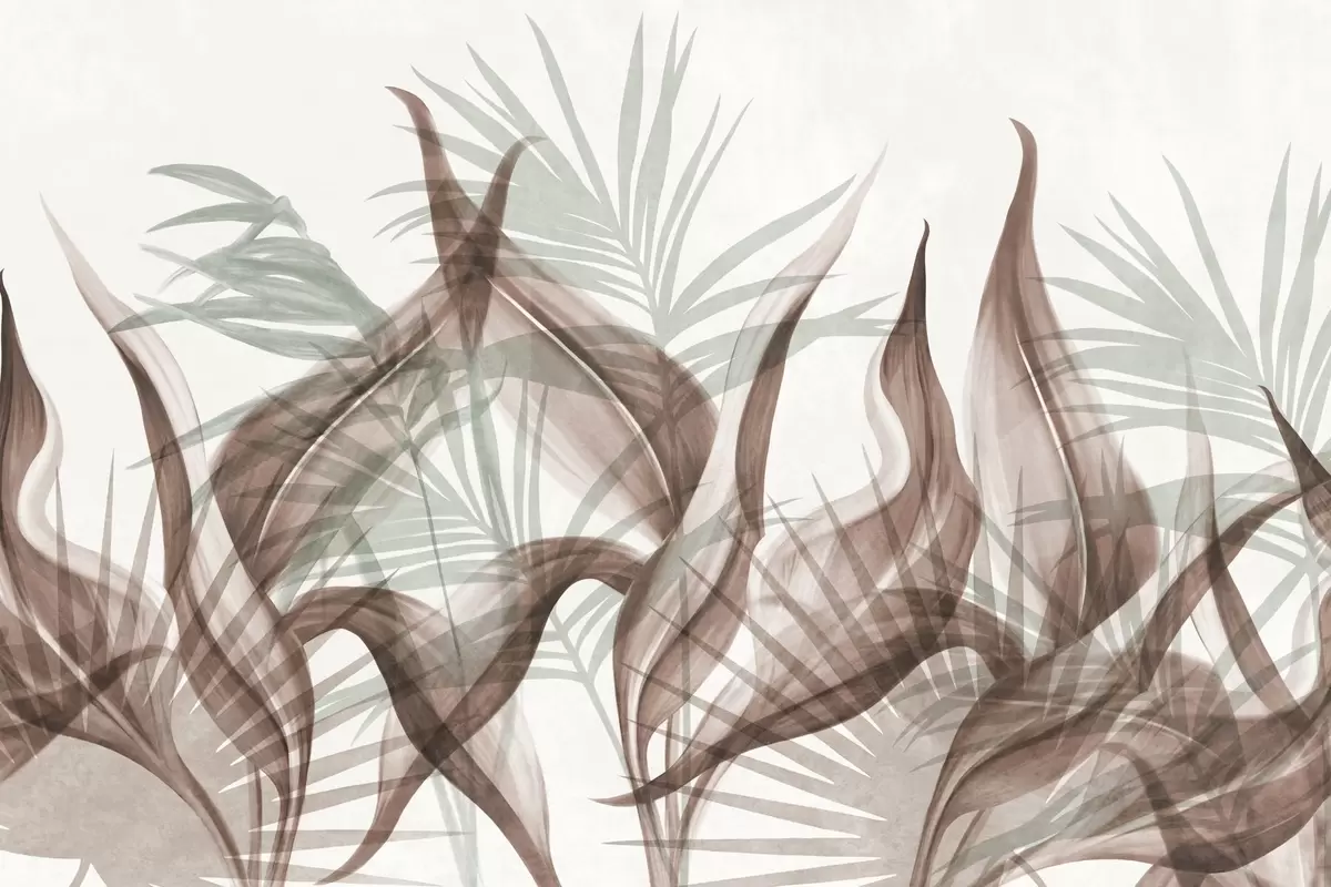 Fototapeta Tropikalne liście w odcieniach brązu i zieleni na białym tle, teksturowane w stylu akwareli Nr w09772