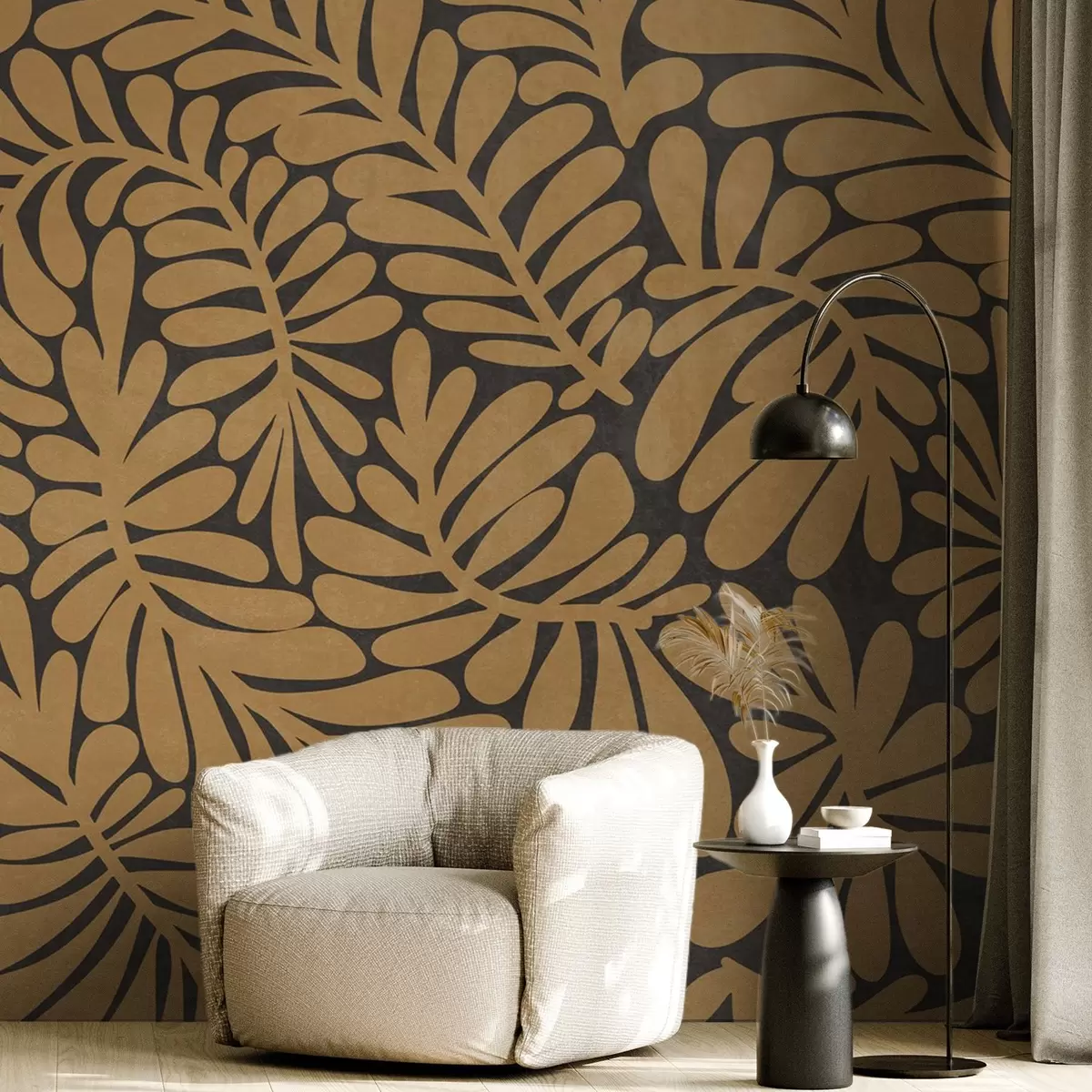 Fototapeta Stylizowane liście w kolorze musztardowej żółci na ciemnoszarym tle, grafika z fakturą Nr w09775