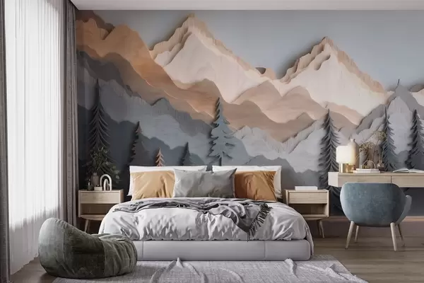 Fototapeta Naturalny krajobraz z sosnami i górami w stylu rzeźbionego drewna Nr w09793