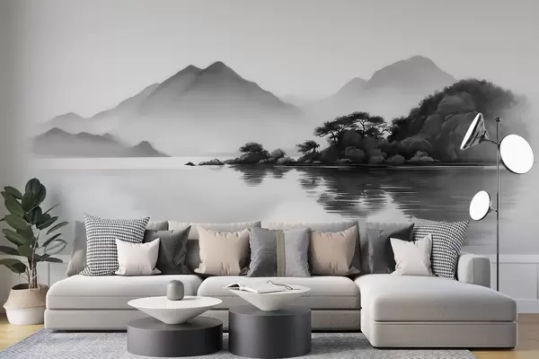 Fototapeta Czarno-biały pejzaż z górami i jeziorem spowitym delikatną mgłą Nr w09803