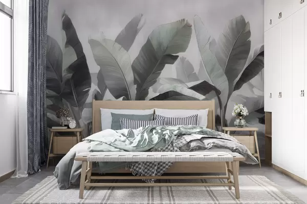 Fototapeta Abstrakcyjne motywy dużych liści bananowca w neutralnej kolorystyce o delikatnych szaro-zielonych odcieniach Nr w09805
