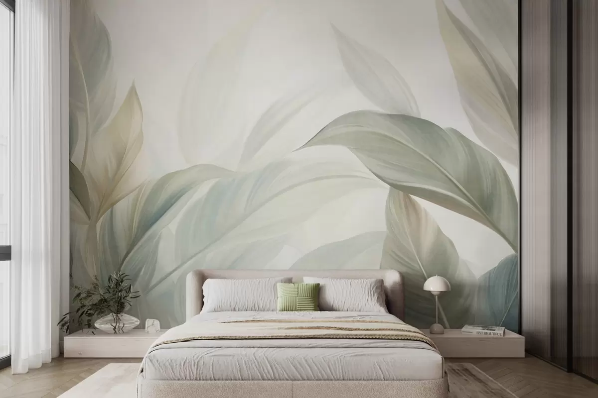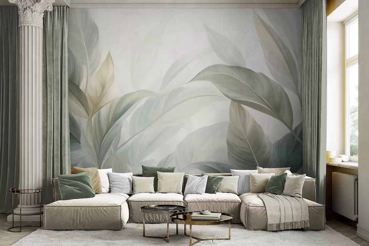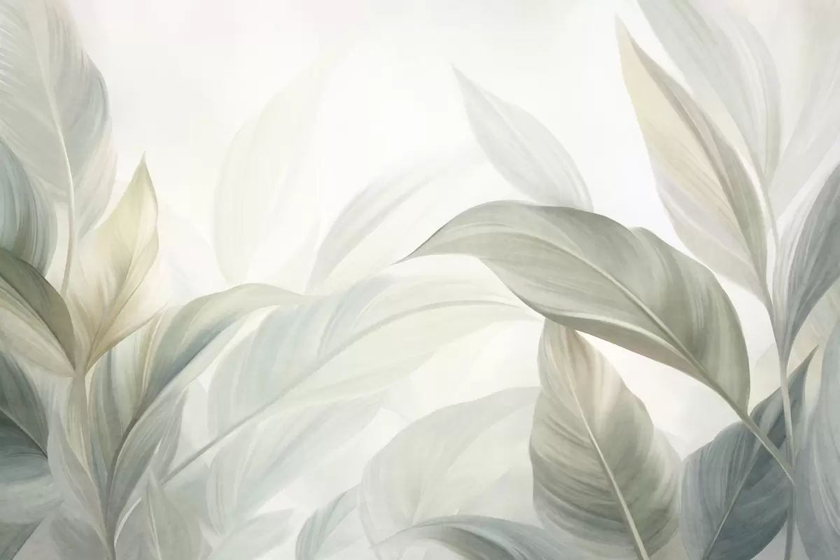 Fototapeta Duże, jasnozielone tropikalne liście w delikatnych, pastelowych barwach, grafika z wyrazistą fakturą Nr w09816