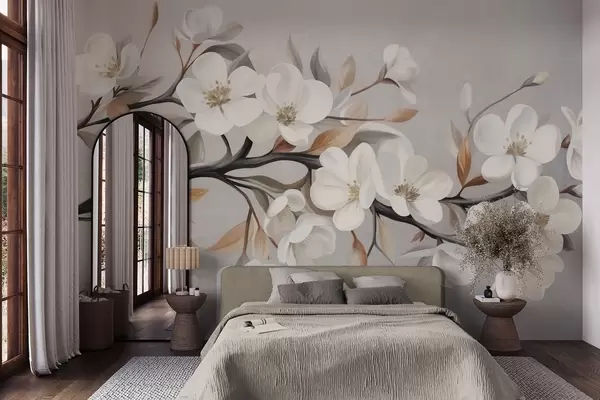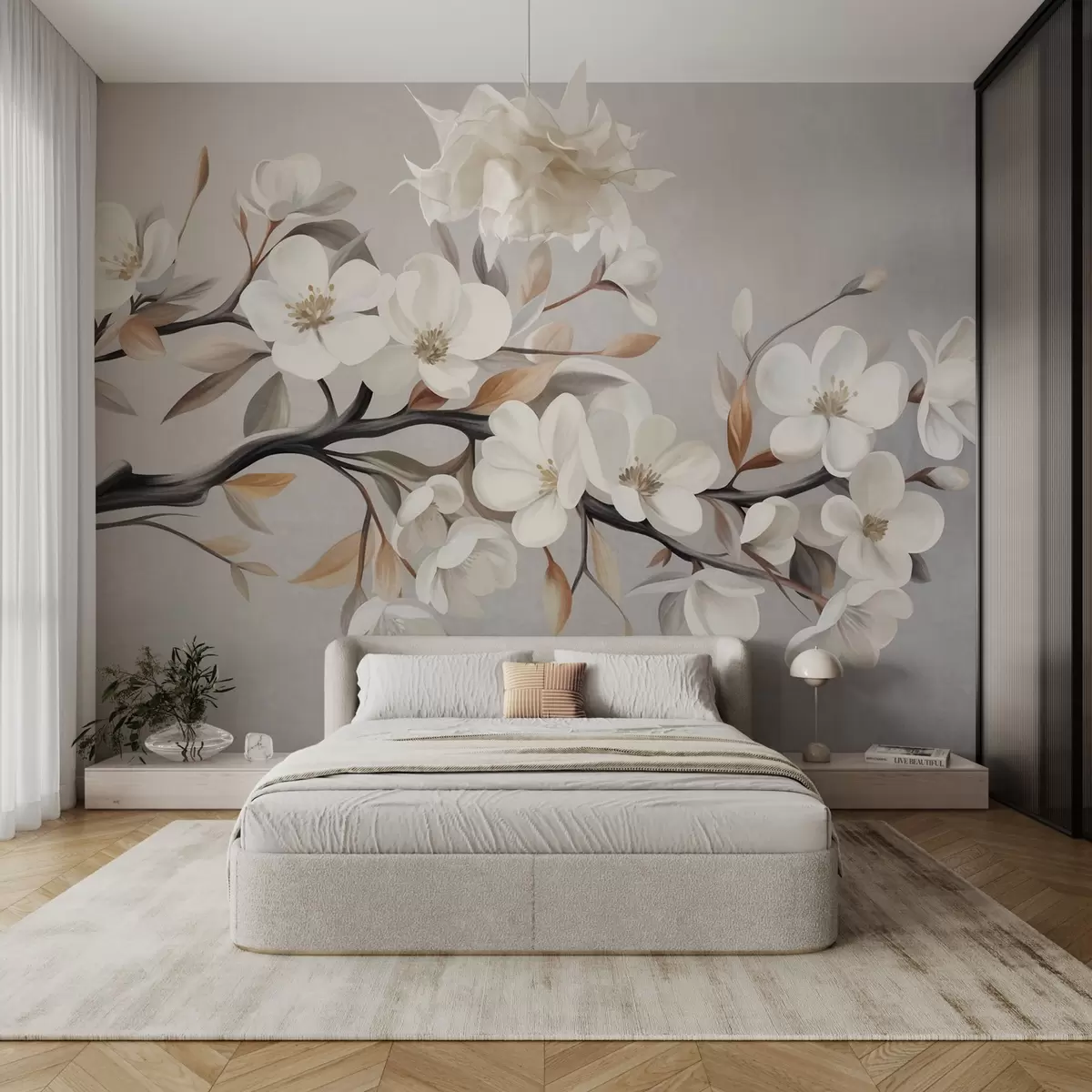 Fototapeta Teksturowana gałązka z białymi kwiatami i brązowymi liśćmi na jasnoszarym tle Nr w09817