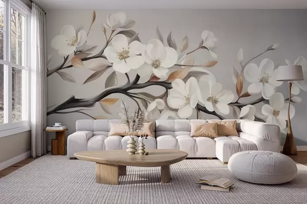 Fototapeta Teksturowana gałązka z białymi kwiatami i brązowymi liśćmi na jasnoszarym tle Nr w09817