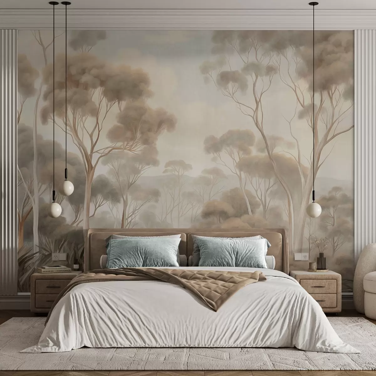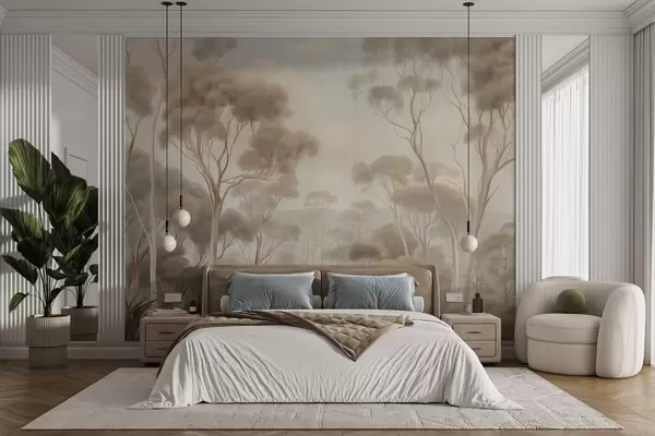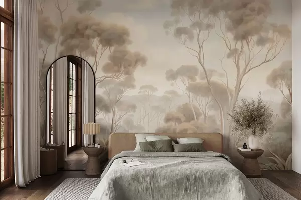 Fototapeta Mglisty leśny krajobraz z wysokimi drzewami eukaliptusowymi, pofałdowanymi wzgórzami pod zachmurzonym niebem, grafika o bogatej fakturze Nr w09822