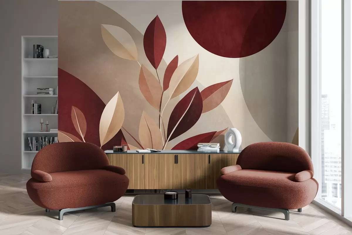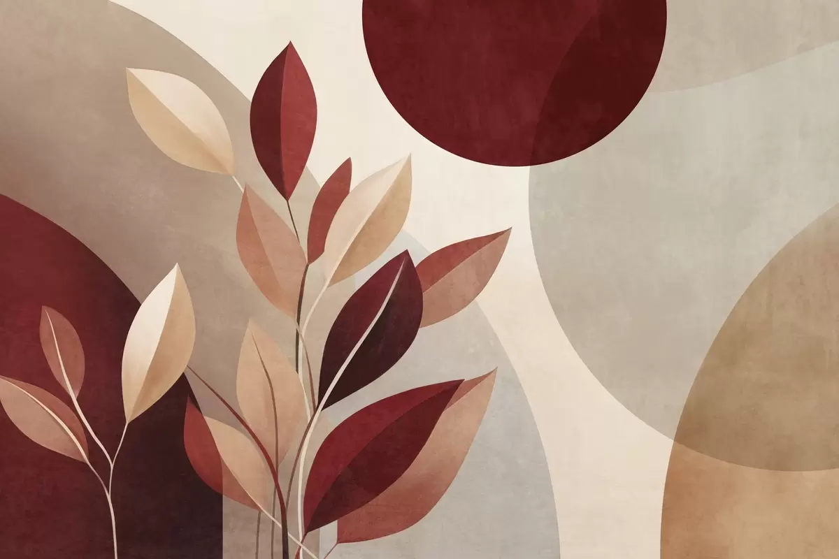 Fototapeta Teksturowane liście w kolorze bordowym i beżowym na tle abstrakcyjnych kształtów, minimalizm, sztuka współczesna Nr w09829