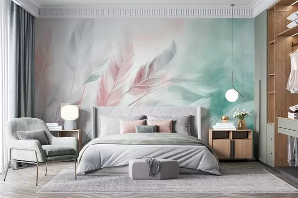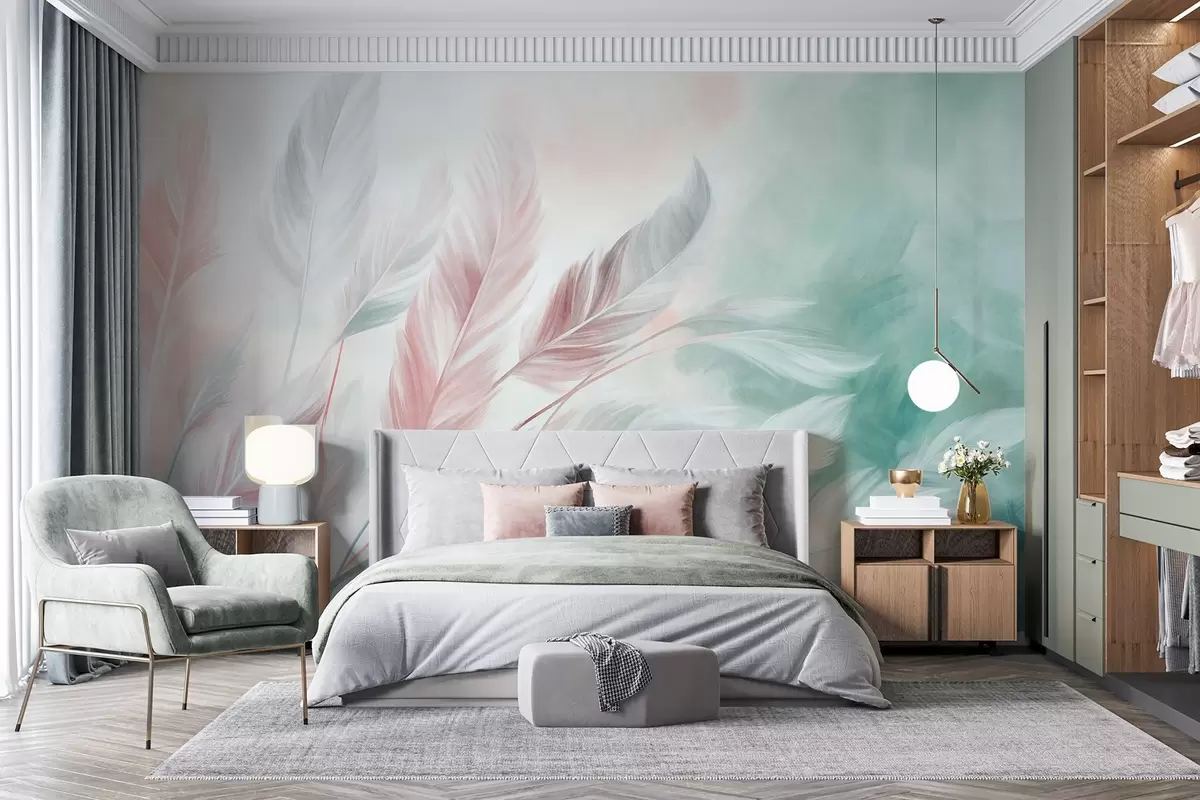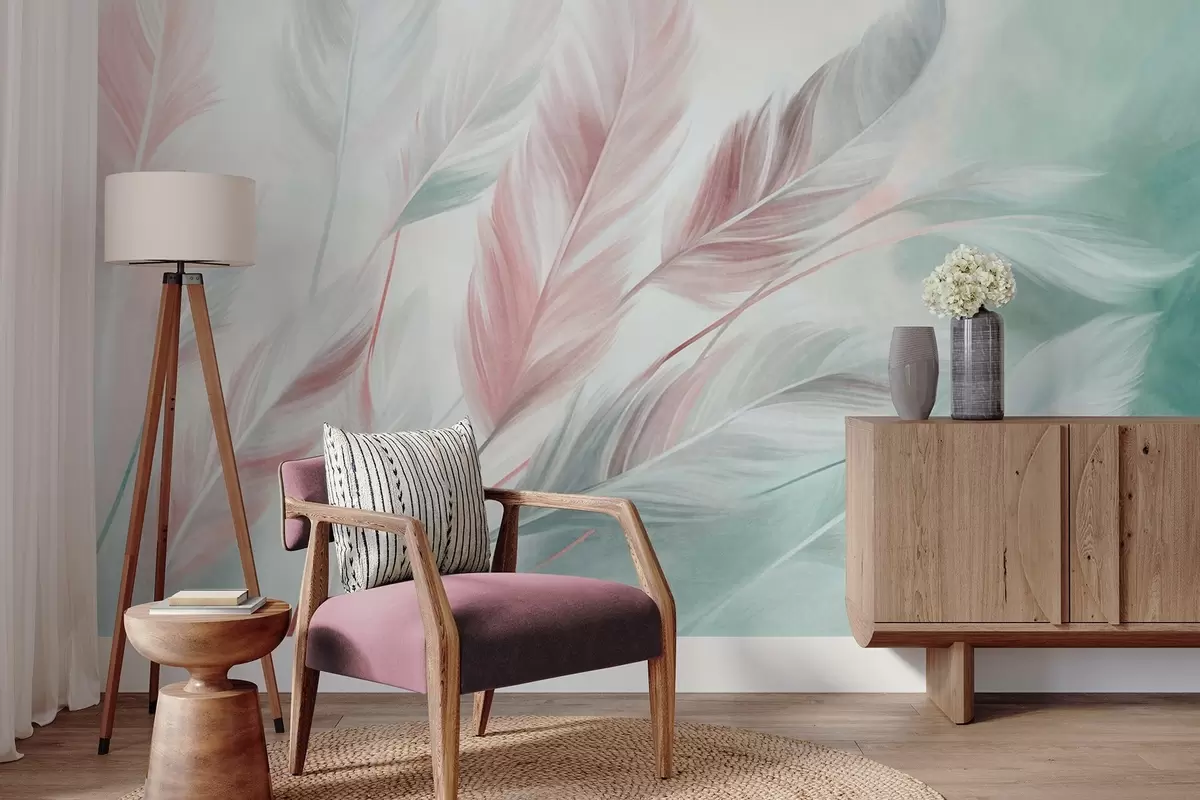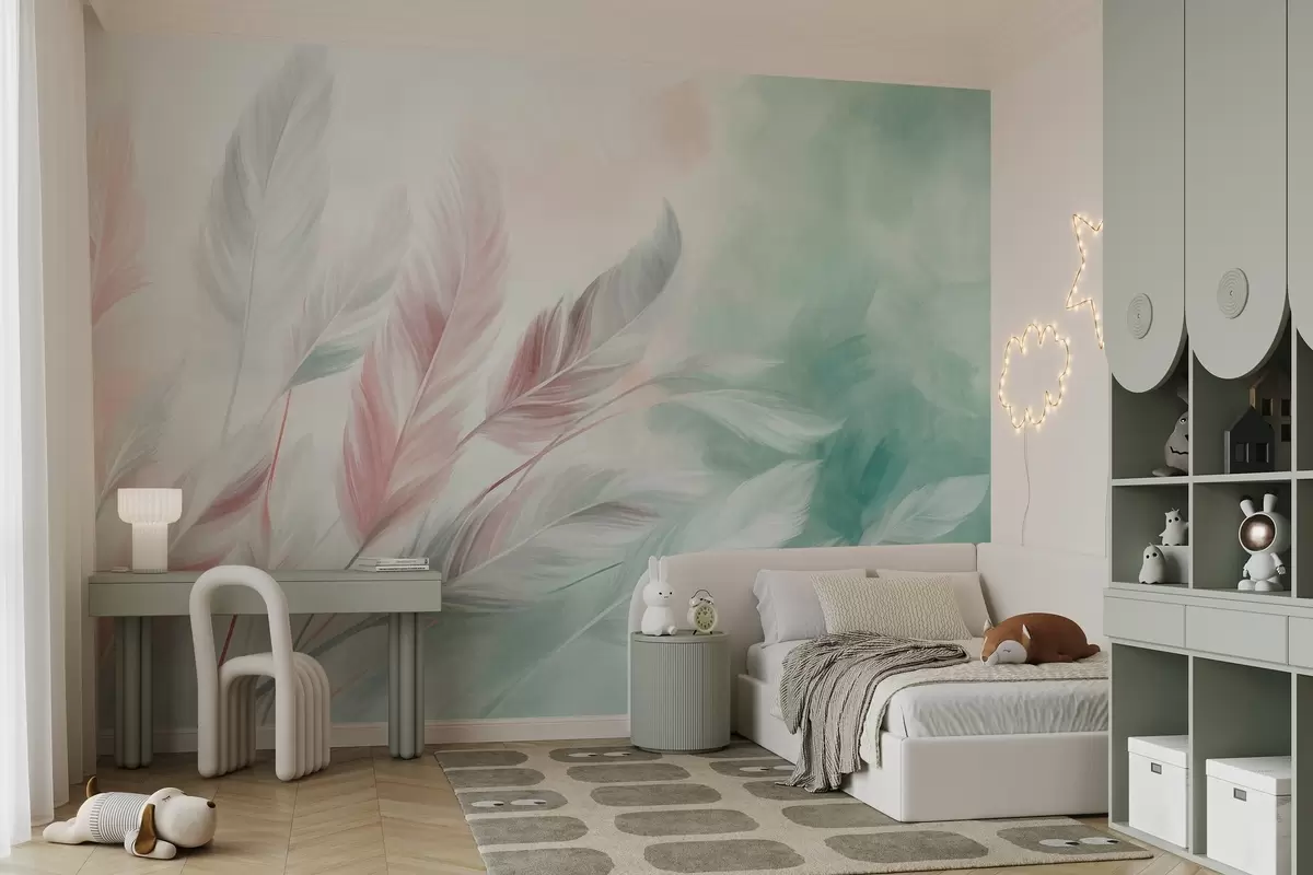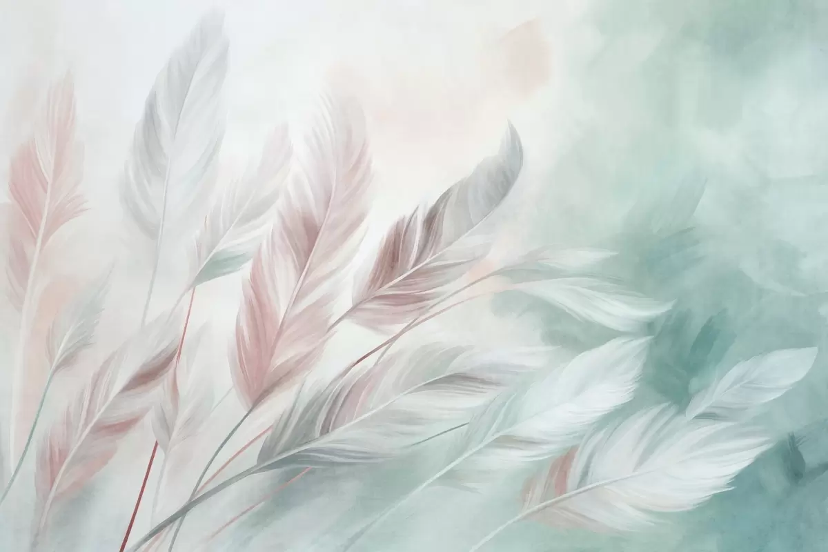 Fototapeta Teksturowane pastelowe piórka o delikatnych, strzępkowatych krawędziach na tle w stylu akwareli Nr w09833v1