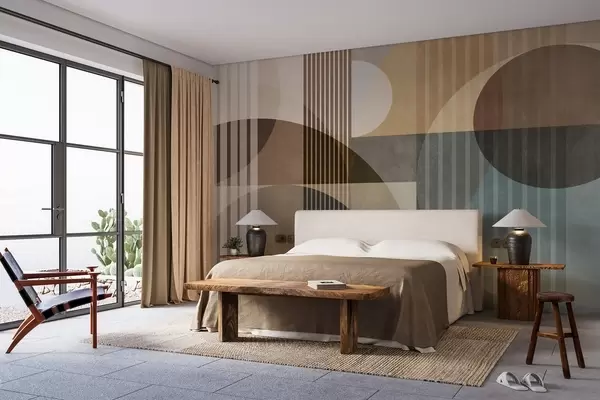 Fototapeta Abstrakcyjne figury geometryczne złożone z okręgów i linii, stonowane odcienie ziemi, kompozycja o bogatej fakturze i warstwowej strukturze Nr w09834