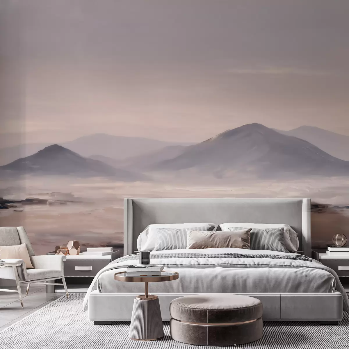Fototapeta Mglisty górski krajobraz z delikatnymi przejściami światła i powietrza, z efektem przypominającym maskę Nr w09844