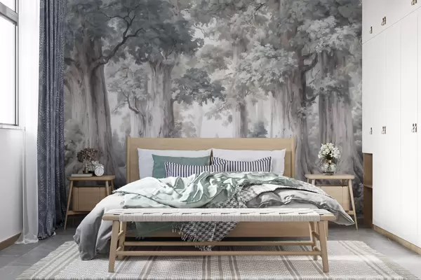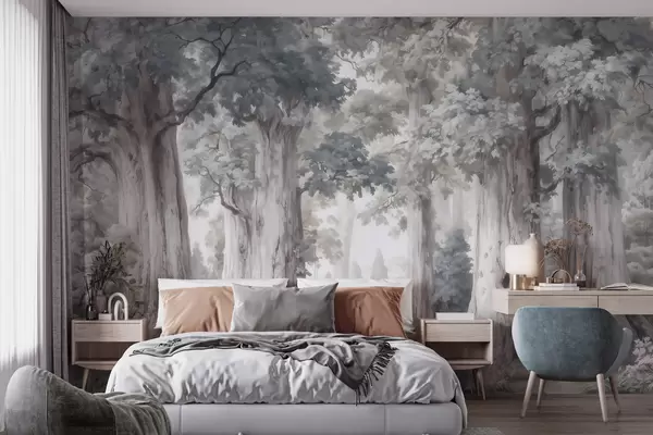 Fototapeta Bajkowy las z wysokimi drzewami i delikatną, stonowaną kolorystyką w stylu akwareli Nr w09849
