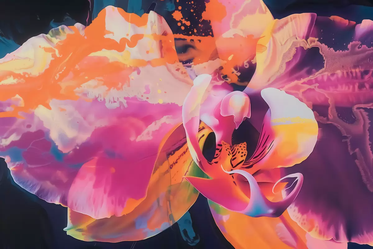 Fototapeta Żywy, abstrakcyjny kwiat orchidei o bogatej kolorystyce i dynamicznych kształtach, utrzymany w stylu akwareli Nr w09855